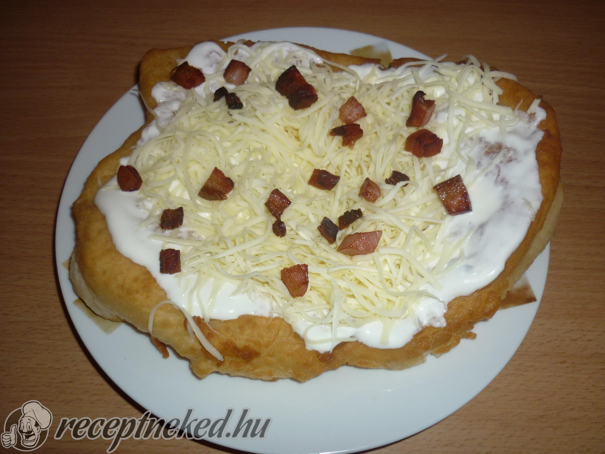 A kész lángosokat megkenjük a fokhagymás tejföllel, megszórjuk a sajttal és a szalonnával.