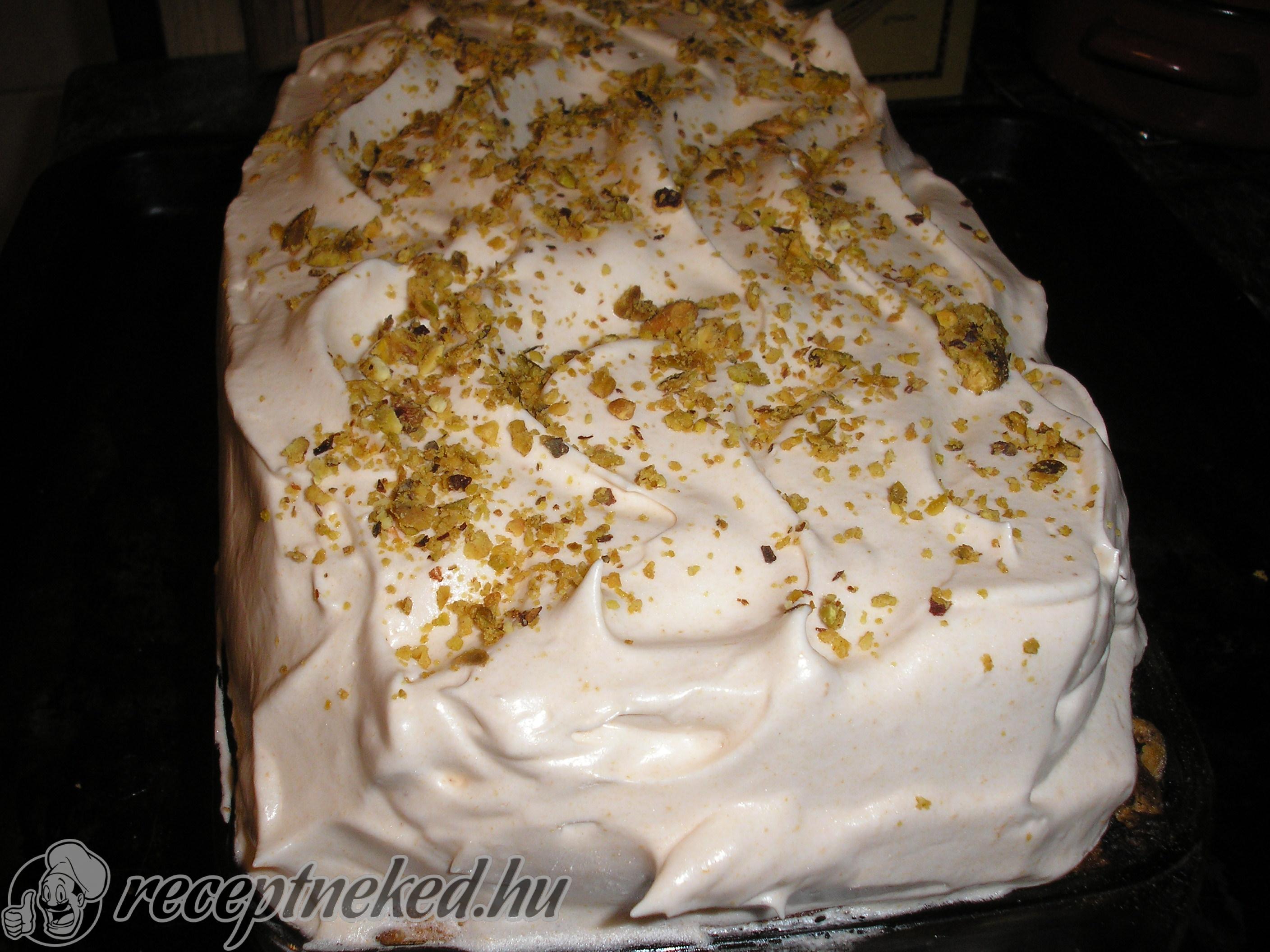 Ha pirosra sült a hab, nyitott sütőajtónál hagyjuk néhány percig a sütőben, nehogy hirtelen összeessen, mikor kivesszük. Felkockázva, langyosan tálaljuk.