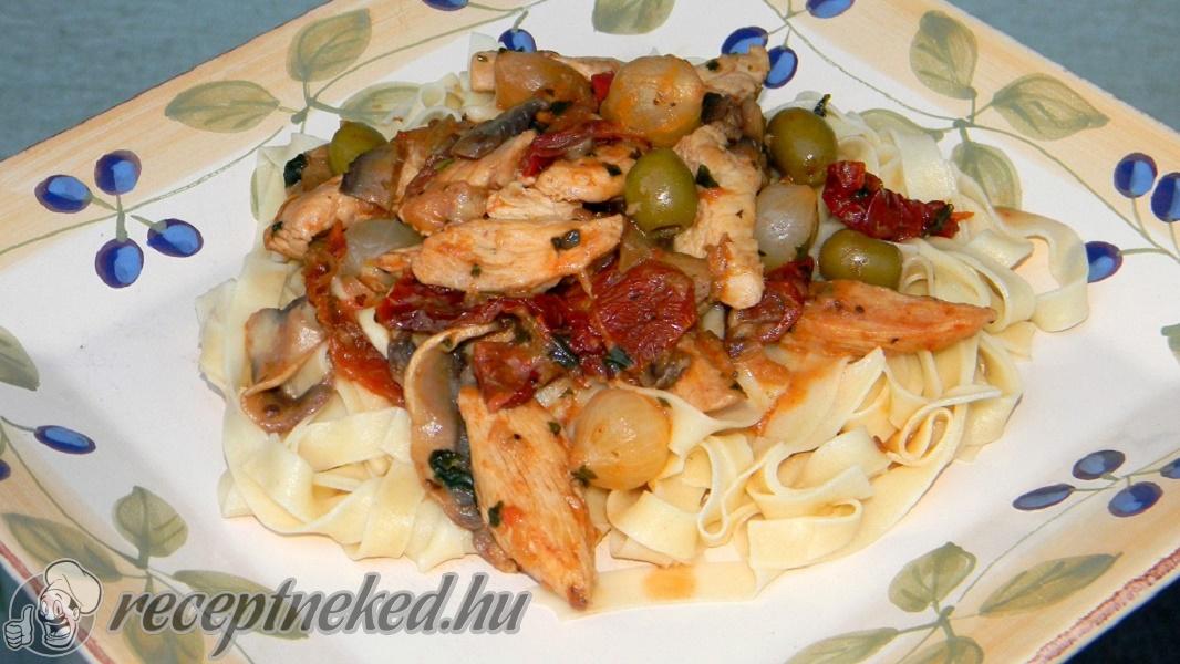 Serpenyőben, olívaolajon megpirítjuk a szeletelt vöröshagymát és a kés lapjával összenyomott fokhagyma gerezdeket. A pácolt csirkemell csíkokat hozzáadjuk, sózzuk, borsozzuk, 5-6 percig pirítjuk, majd beletesszük a szeletelt gombát, az egészben hagyott olajbogyót, a csíkokra vágott szárított paradicsomot és a gyöngyhagymát.