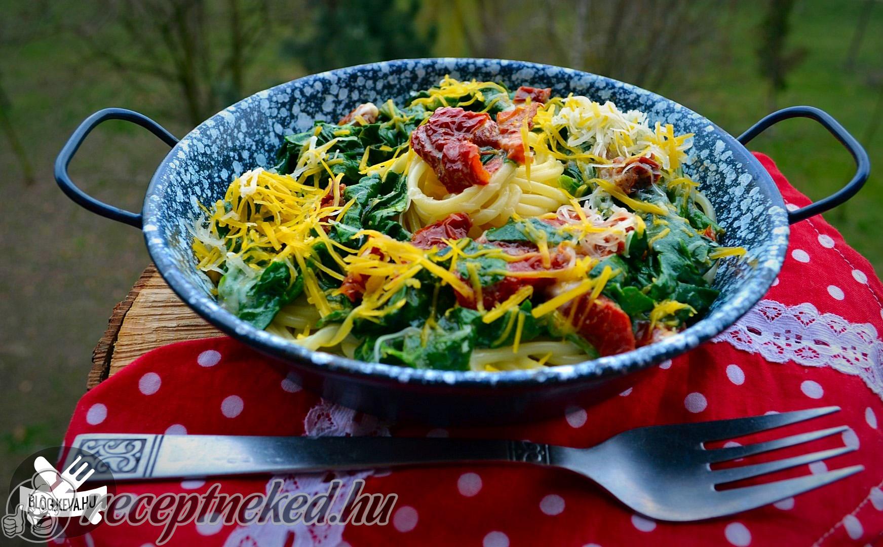 Közben egy serpenyőbe olívaolajat öntünk, arra ráteszünk egy gerezd fokhagymát, majd rádobjuk a jól megmosott spenótleveleket, a főzővízből egy-két evőkanálnyit ráöntünk, illetve 1 dl tejszínt is hozzáadunk.