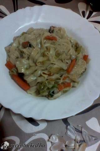 Külön megfőzöm a tésztákat és mikor elfőtte a levét a hús, akkor hozzáadom a tésztát is. Vigyázni kell, hogy a ne legyen sok víz alatta. Utána megsózom, borsozom, ha kell még bele még szójaszósz lehet bele rakni.