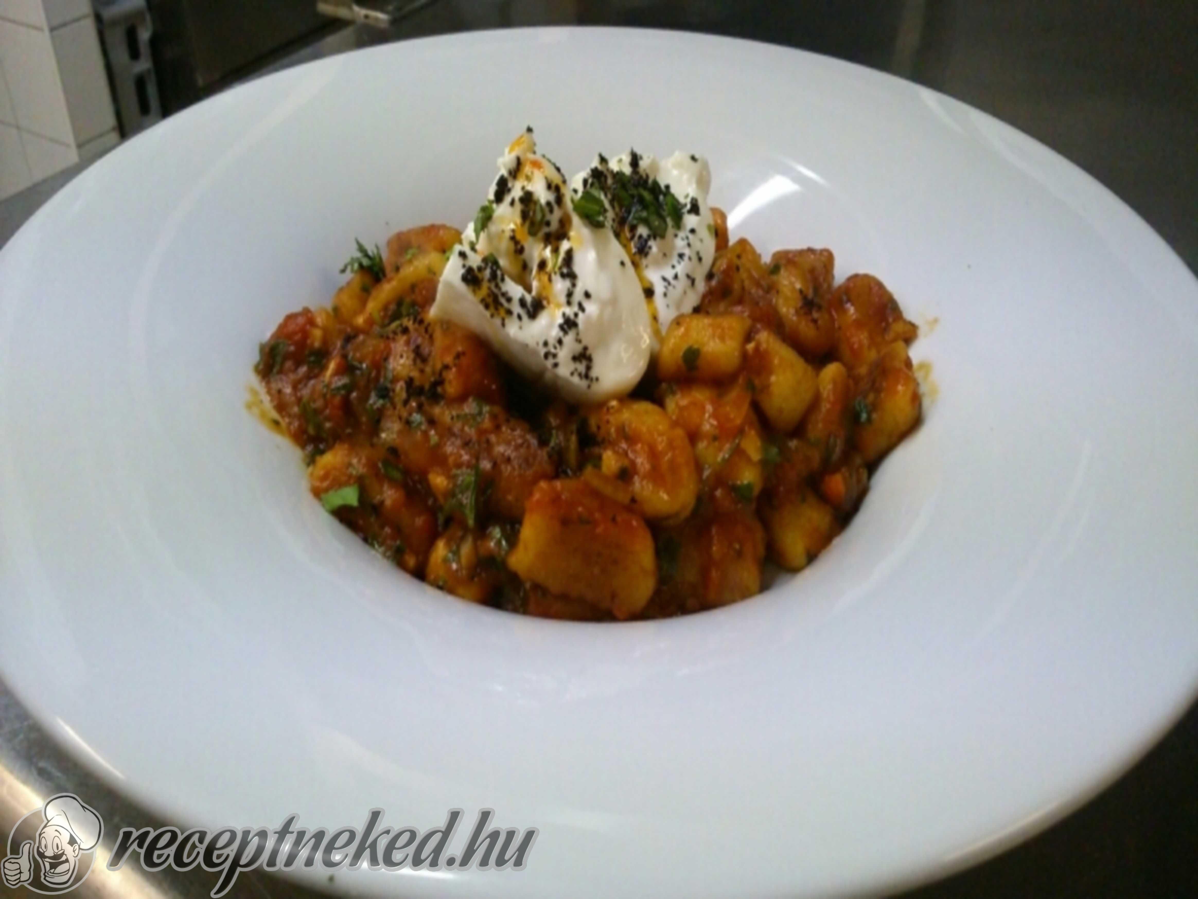 Ha elkészül a szósz, a megpirított gnocchira öntjük és jól összeforraljuk.