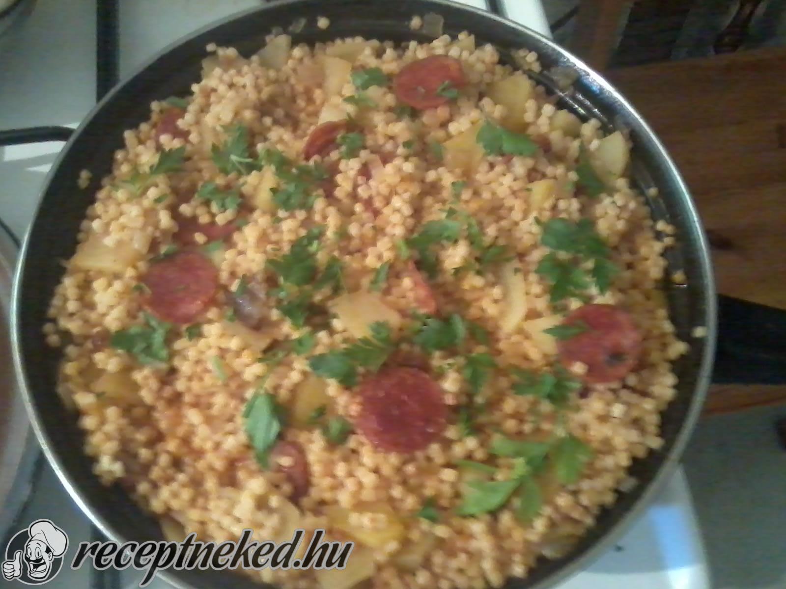 Felforraljuk, majd takarék lángon addig főzzük, hogy a tészta szemek megpuhuljanak.