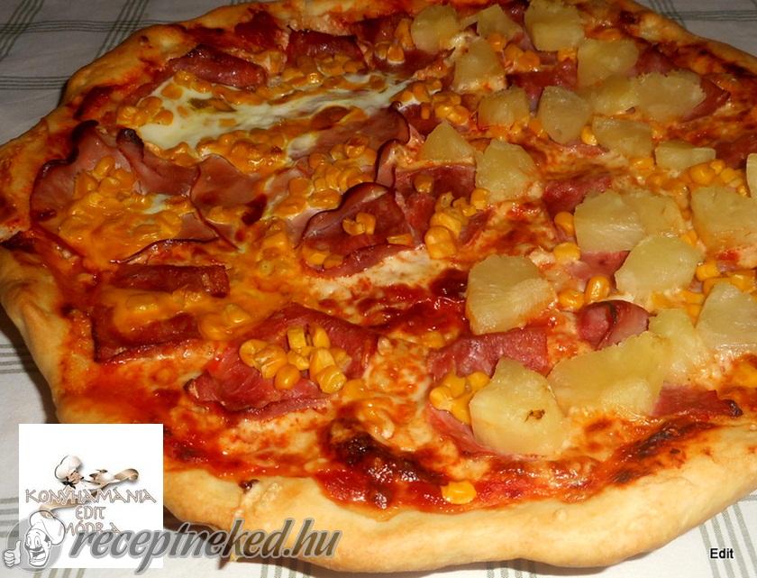 A pizza tésztánkat megkenjük a szósszal, rátesszük a reszelt sajtot, majd a sonka szeleteket félbe hajtva ,megszórjuk kukoricával.