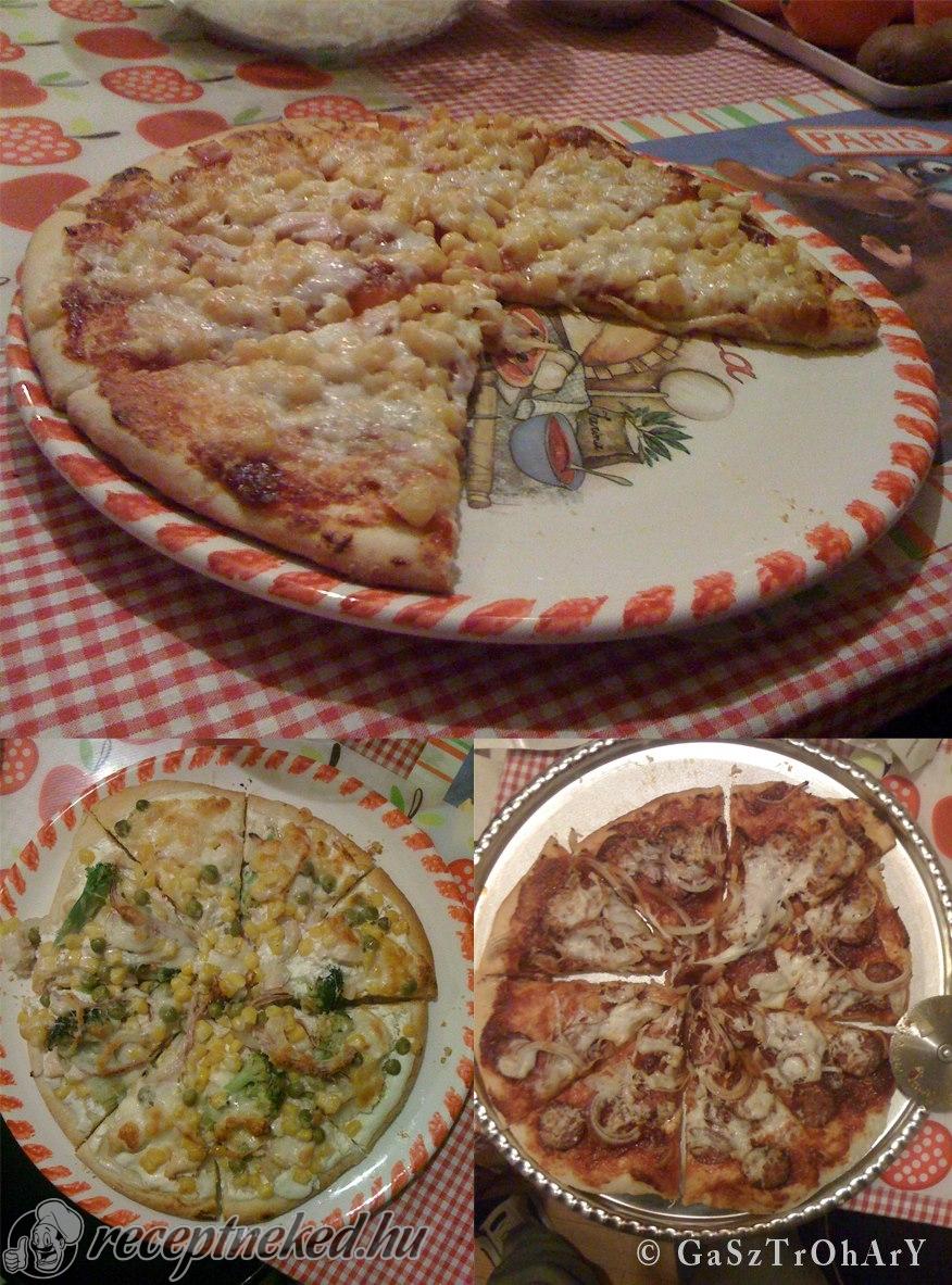 Tészta: A lisztet, sót,olajat, meleg vizet, és tejben cukorral felfuttatott élesztőt jól összedolgozzuk és alaposan bedagasztjuk. Egy órán át kelni hagyjuk, négy felé vesszük a tésztát, kézzel kör alakúra húzgáljuk és olajozott tepsin tetszőleges feltéttel forró sütőben 10-12 perc alatt kisütjük. Nem baj ha nem tökéletes kör alakú, hidd el, ez nem fog zavarni evés közben .