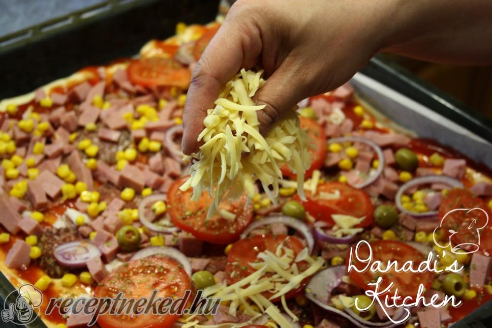 Ebből az adagból 3 normál pizza készül, vagy 1 nagy tepsinyi adag. Nyújtsuk tehát a kíván méretűre, a tetejére tetszés szerint tegyük rá a hozzávalókat.