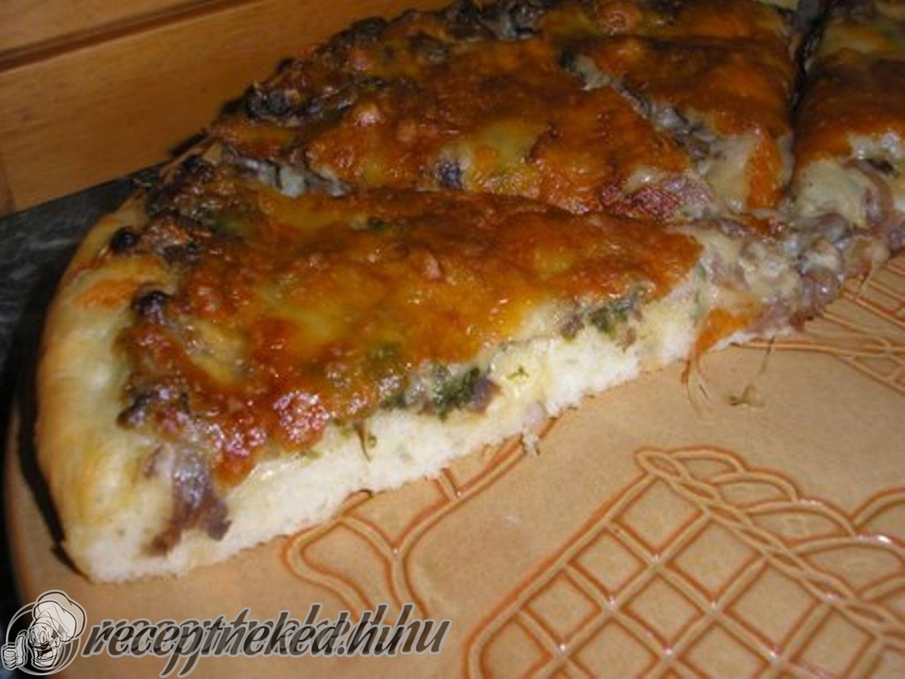 Egy pizzasütőt olajjal kikenünk, majd egyenletesen kibéleljük a tésztával. Fokhagymás olajjal megkenjük, majd villával megszurkáljuk és eloszlatjuk rajta a gombás krémet. Rászórjuk a durvára reszelt sajtot.