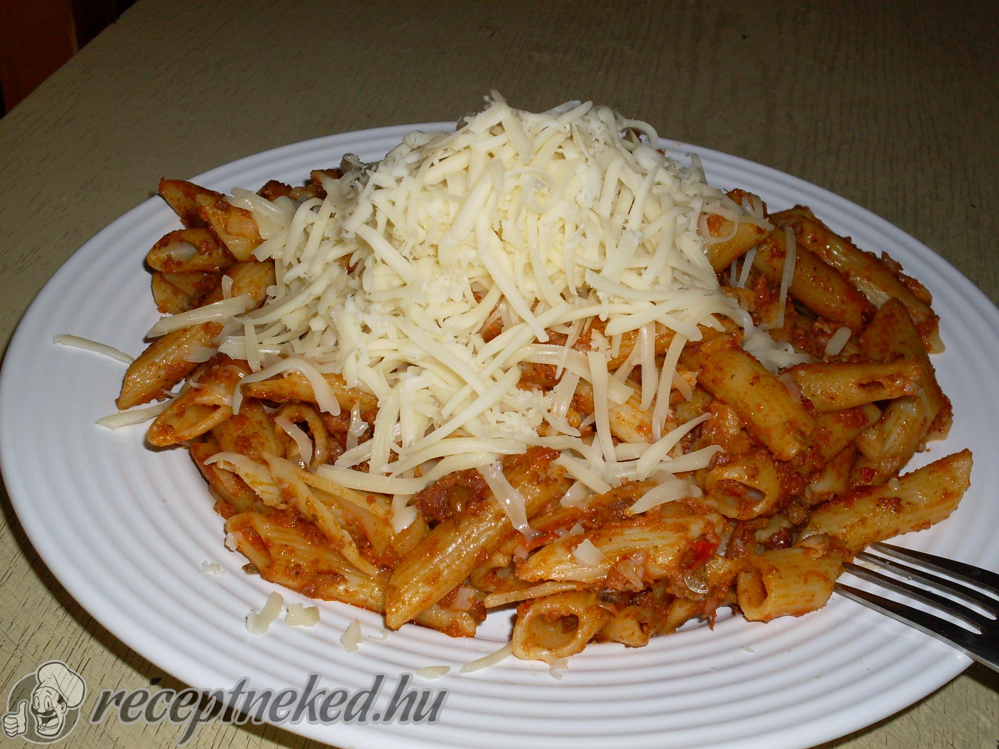 Összerottyantom, erre a kész szószra teszem a kifőtt tésztát, majd elkeverem és reszelt sajttal tálalom.