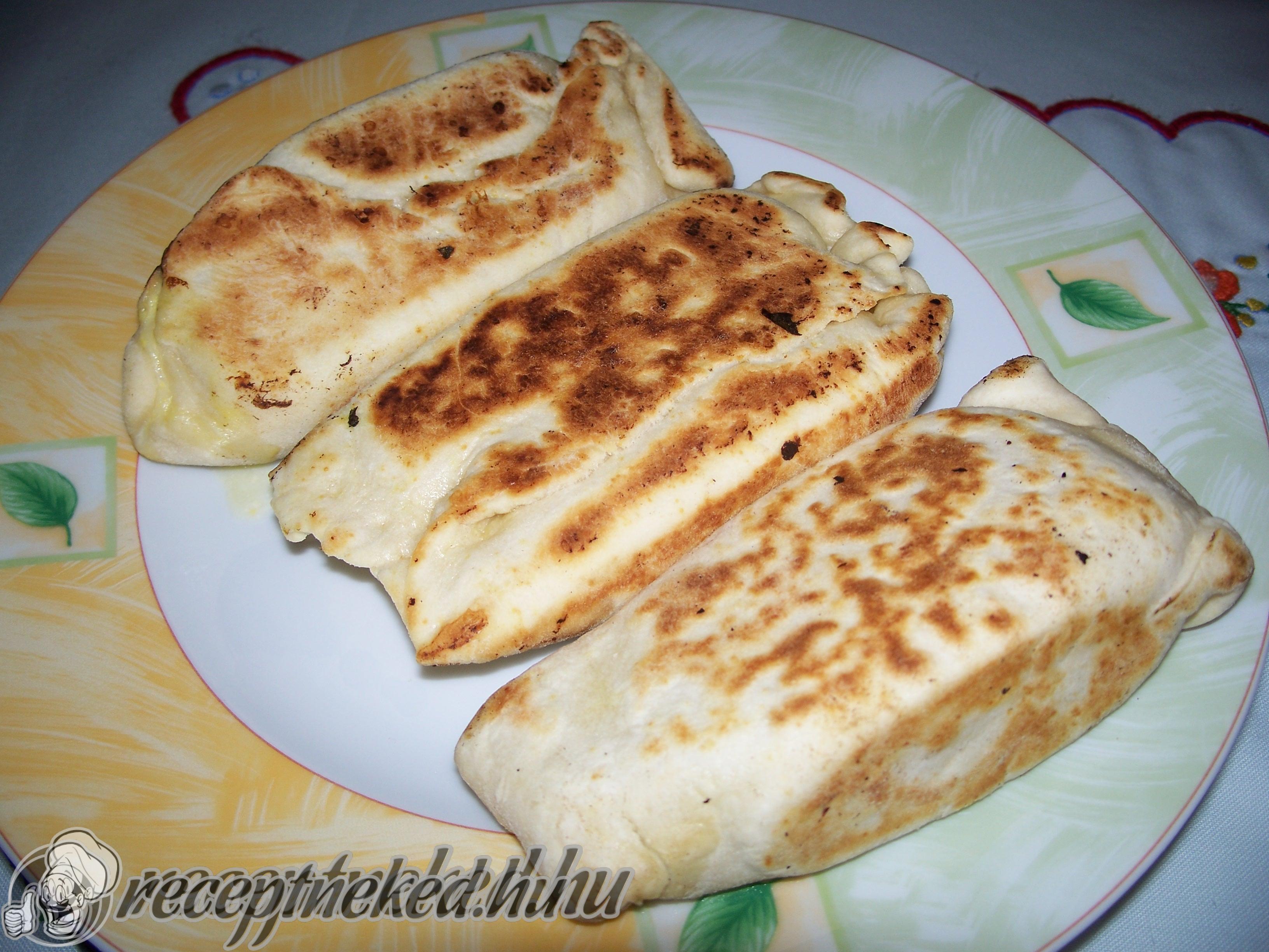 A serpenyőbe olaj nélkül kell beletenni a tésztát – én két pupusast sütöttem egyszerre. Először azt a részét tegyük lefele fordítva, ahol összenyomkodtuk a tésztát, hogy az szépen megsüljön és ne tudjon a töltelék semmi módon kifolyni.