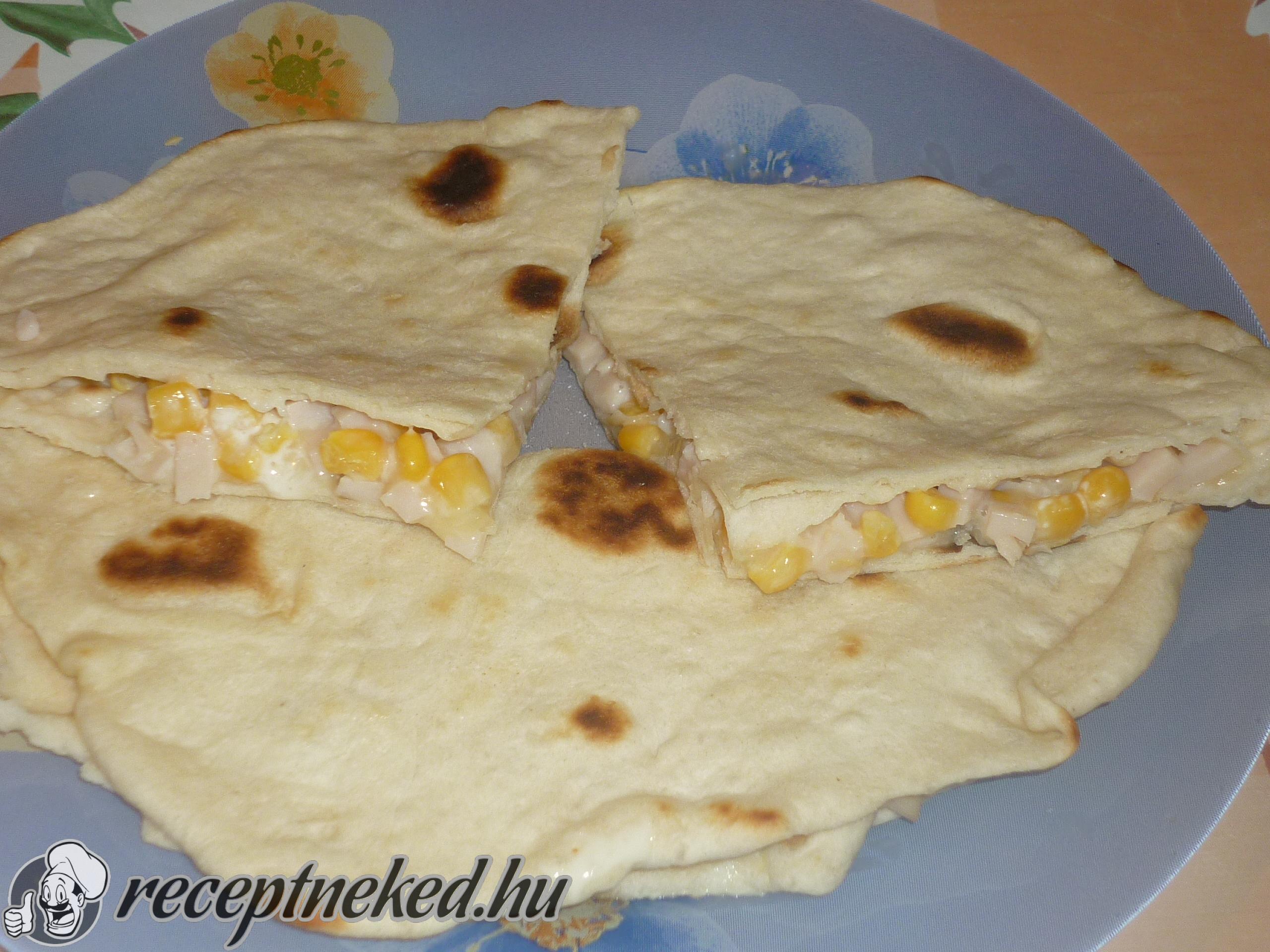 A tészta hozzávalót elkeverjük, lisztezett deszkán kb 5-6 percig gyúrjuk, amíg ruganyos tésztát kapunk. Ha ez megvan akkor10 részre osztjuk és kis korongokat formálunk belőle. Majd 30 percig pihentetjük őket. Ha kipihenték magukat akkor sodrófával 2-3 mm laposra nyújtjuk őket (nyugodtam mehet jó laposra, mert felhólyagozódik megnő sütés közben). Serpenyőben olaj nélkül sütjük amit előmelegítünk. 1-2 perc alatt az egyik majd megfordítva a másik oldalát is megsütjük.
