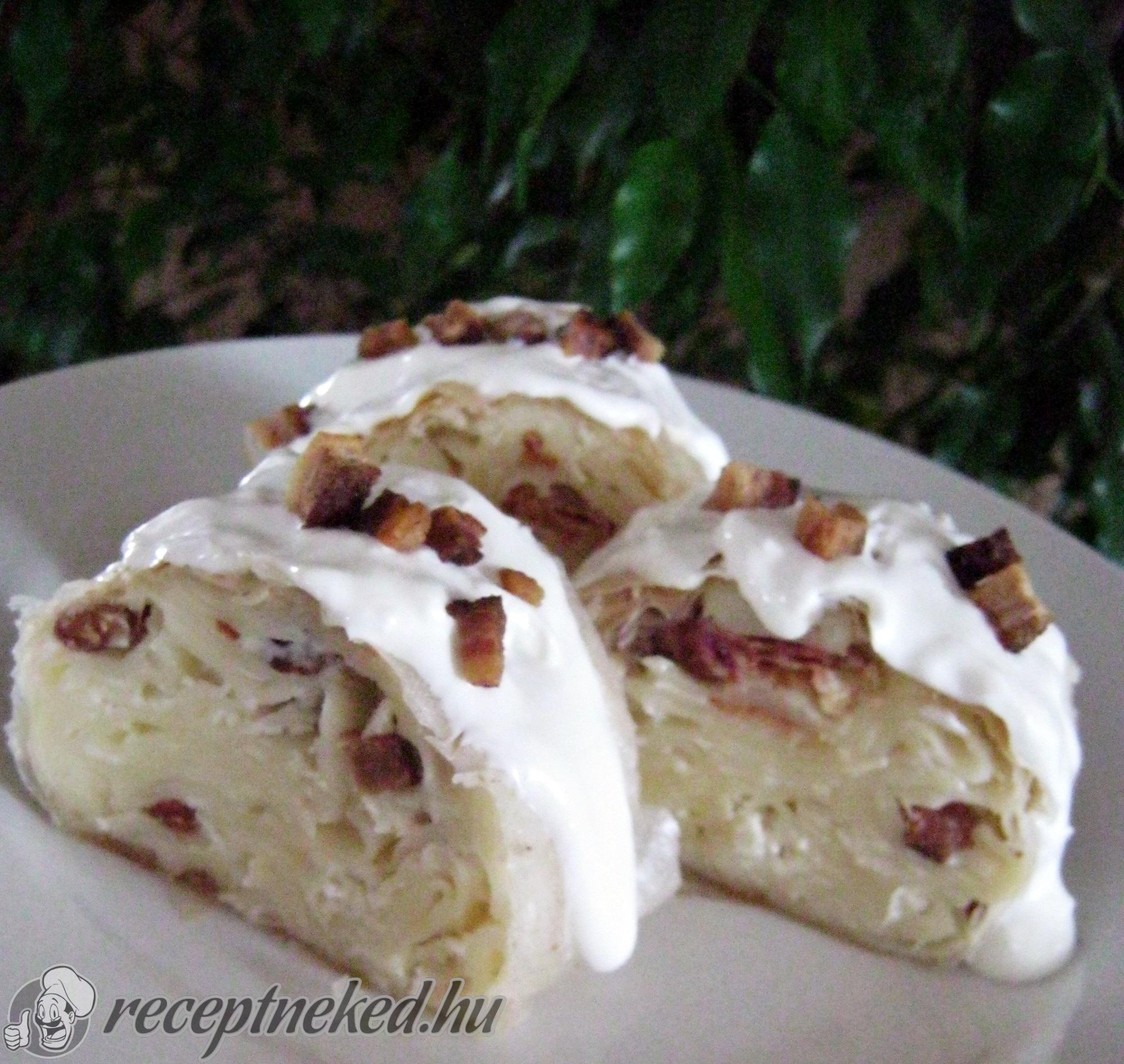 A tésztát elkeverjük a tejfölös túróval és a kisült szalonnával (a zsírt tegyük félre).