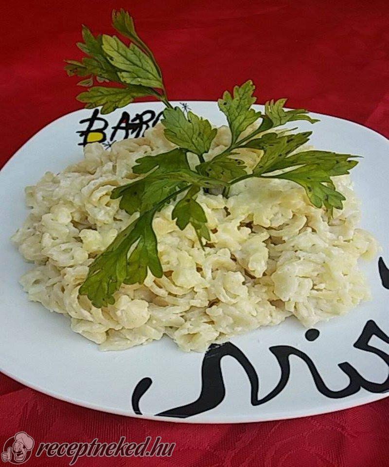 Amikor elkészűlt a tészta, akkor hozzákeverjük a tejfölt, sózzuk és borsozzuk. Rászórjuk a reszelt sajtot és a szalonnát, majd tálaljuk.
