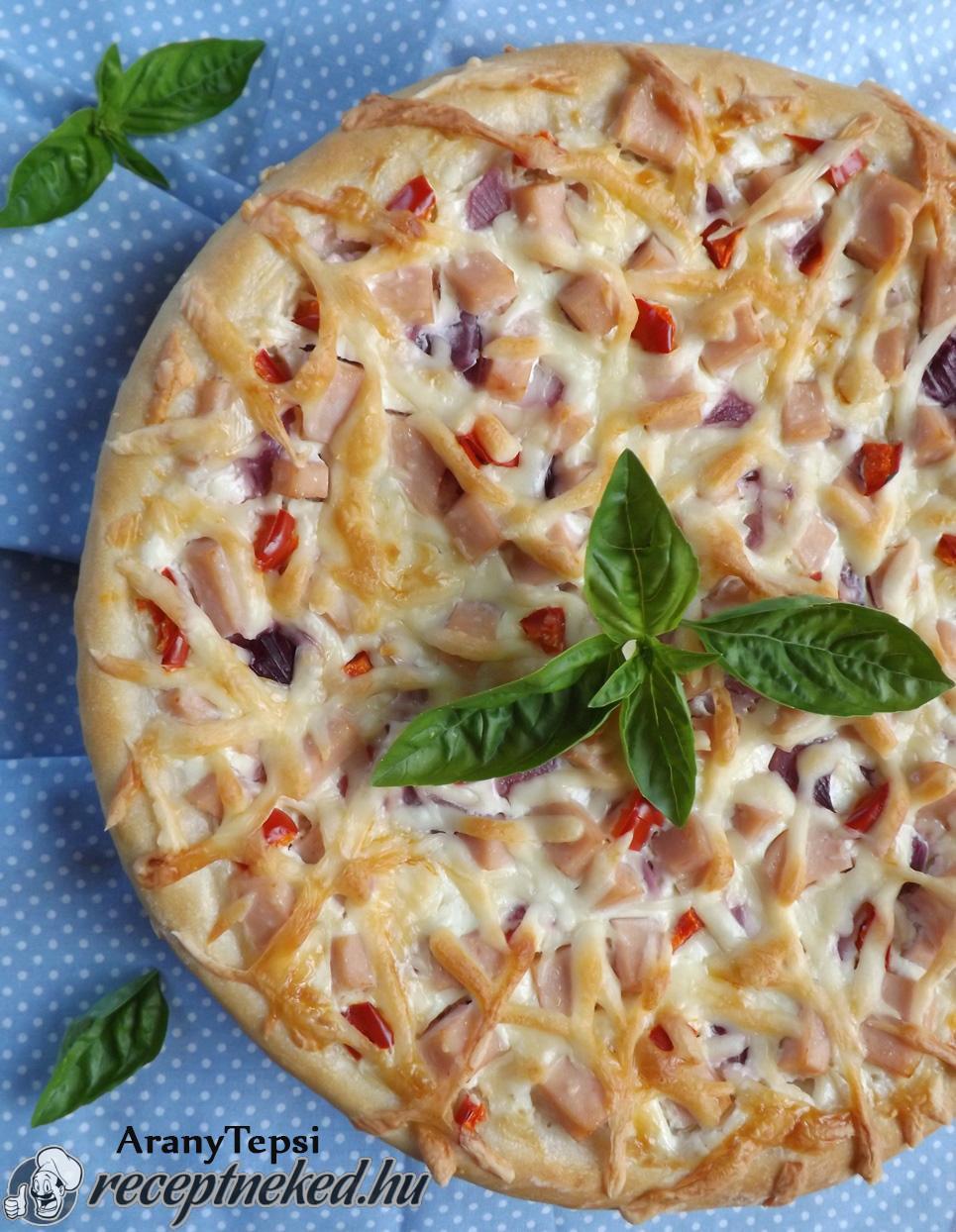 A megkelt tésztát az előkészített formába nyomkodjuk. Megkenjük a fokhagymás-sajtos tejföllel. Megszórjuk a lilahagymával, sonkával, pritamin paprikával és meghintjük a reszelt sajttal.