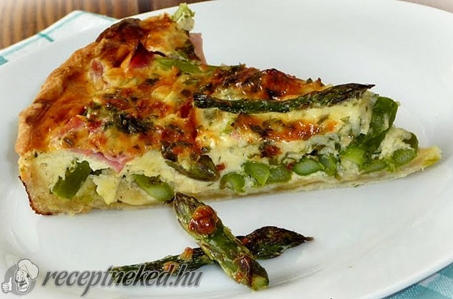 Az elősütött tésztára rápakoljuk a spárgát és a sonkát, majd óvatosan ráöntjük az összekevert tejfölös-tojásos masszát.