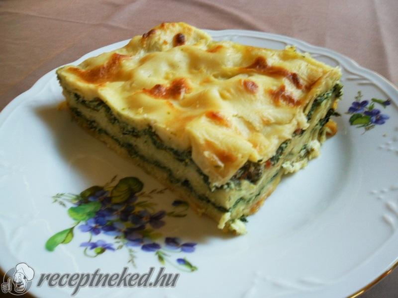 A hamis lasagne összeállítása: zsírozott, rizslisztezett tepsibe terítjük a tészta felét, erre jön a besamel mártás fele, a darált húsos töltelék, a lecsepegtetett spenót, a tészta másik fele, a besamel mártás másik fel, a tetejére reszeljünk sajtot és előmelegített sütőben süssük készre kb 20 perc alatt.