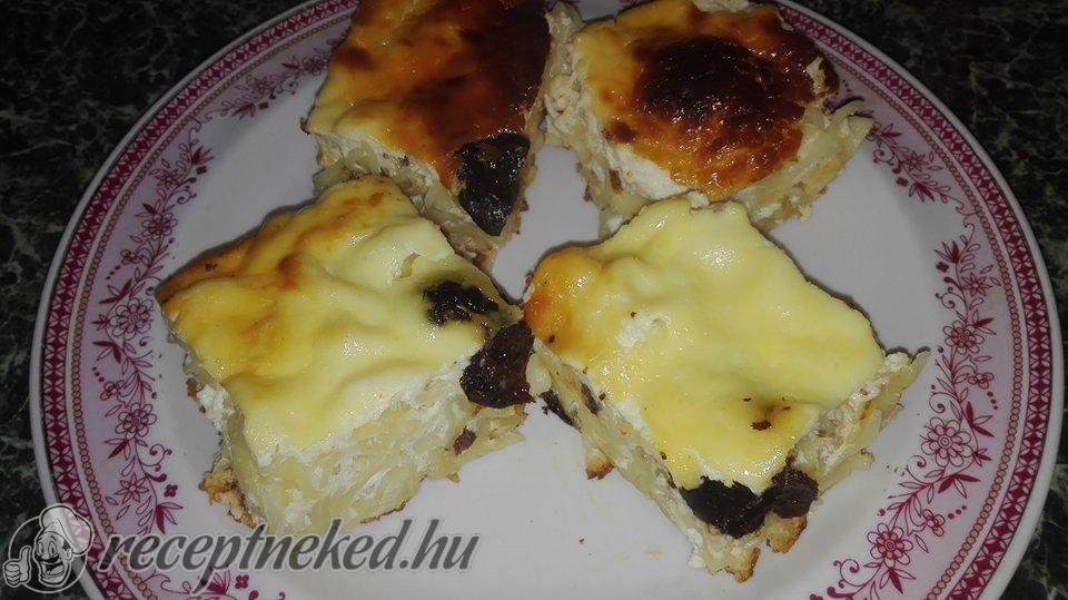 A tojásokat kikeverjük a cukorral, joghurttal, tejföllel és a tejjel. A kész masszát ráöntjük a tésztára, rászórjuk a mazsolát és a szilvát, majd alaposan összeforgatjuk.