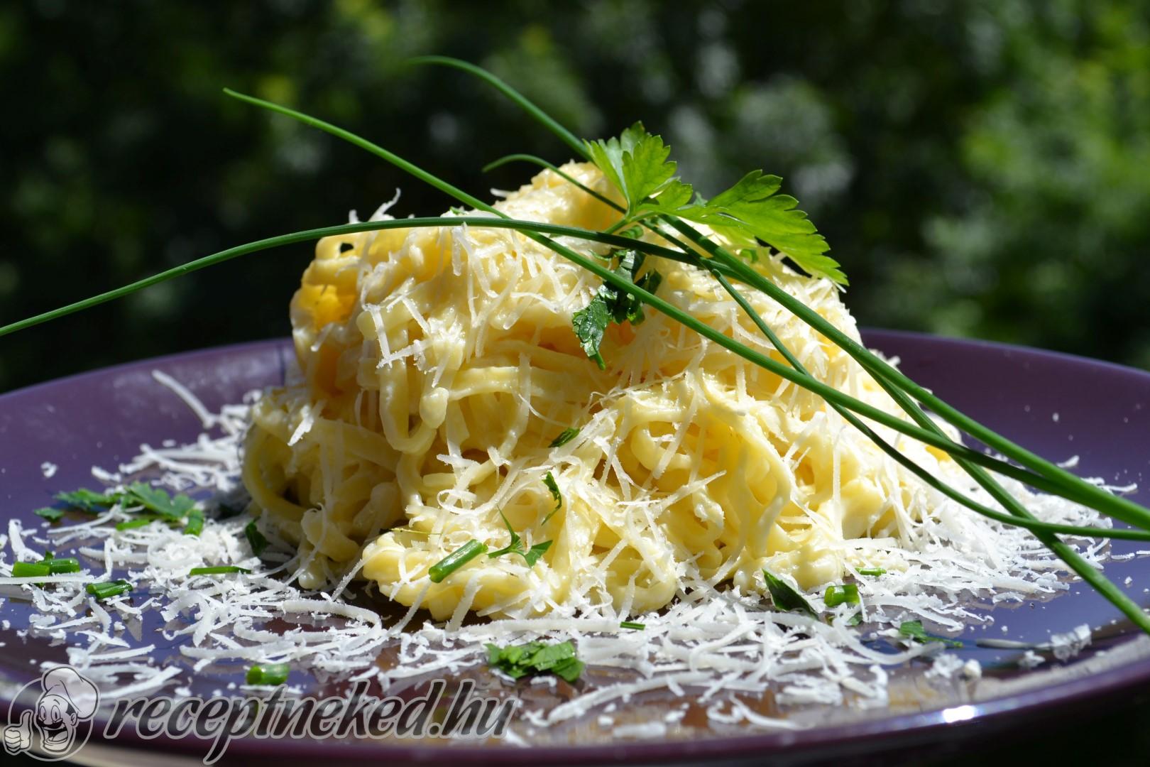 A leszűrt tésztát öntsük a sajtos-tejszínes mártáshoz és keverjük jól össze. Tálalás előtt szórjuk meg apróra vágott metélőhagymával, petrezselyemmel és reszelt parmezánnal.
