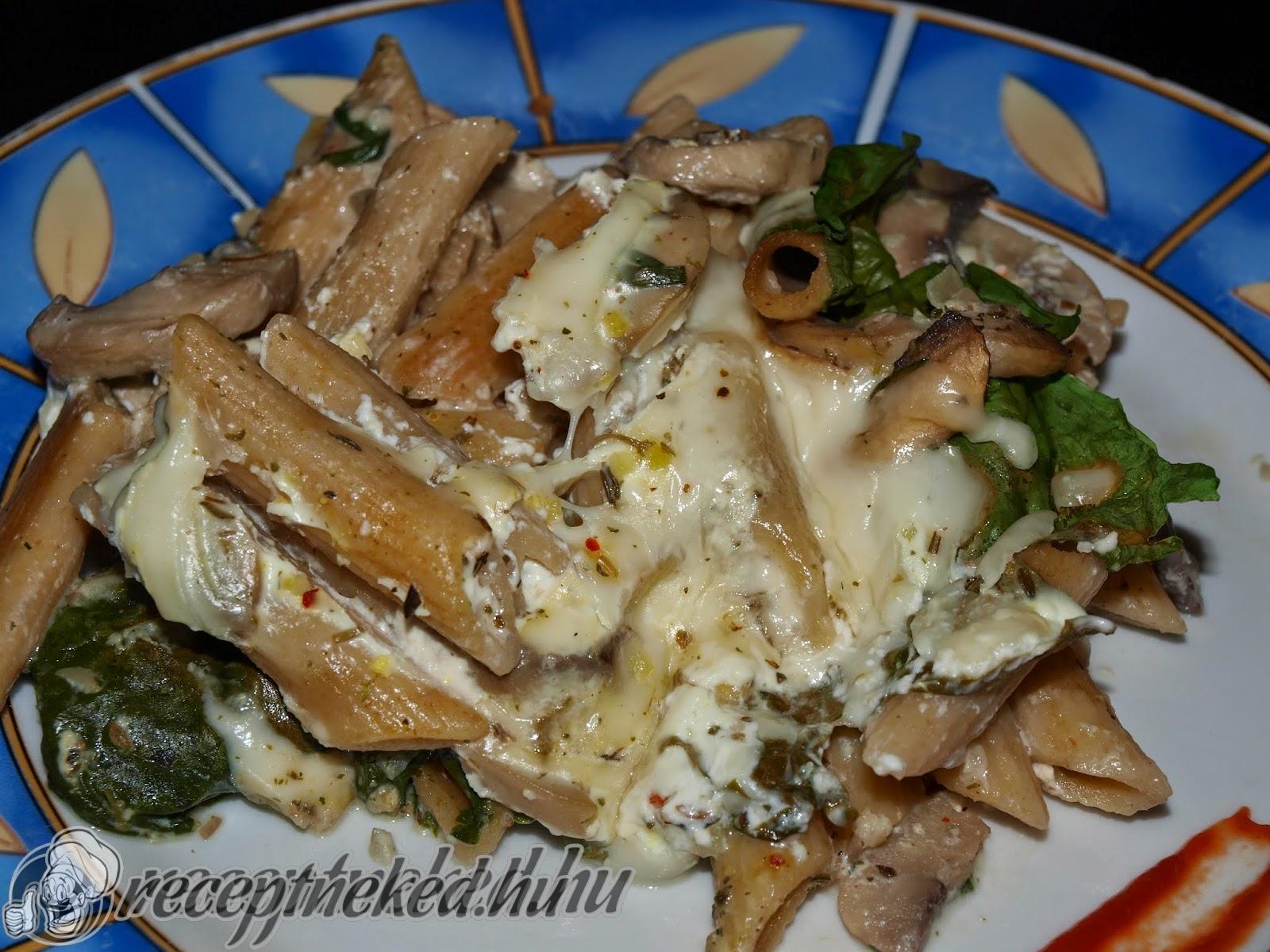 A tésztát leszűrjük, majd hozzáforgatjuk a tejszínes szószhoz, fél órát állni hagyjuk fedő alatt, végül reszelt sajttal tálaljuk.