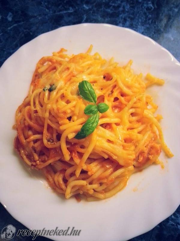 Közben a spagettit sós vízben kifőzzük, leszűrjük, és a paradicsomos alaphoz forgatjuk. Ha szükséges, adhatunk hozzá még kevés vizet, majd rozmaringgal ízesítjük, és összeforraljuk.