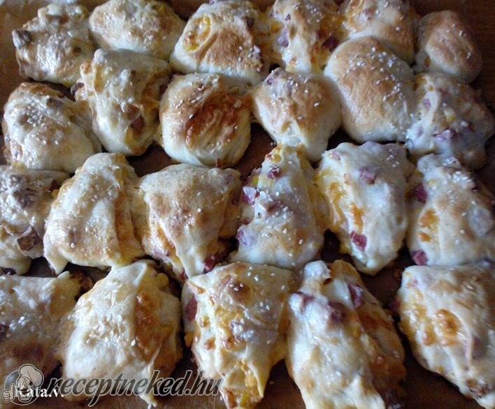 Mikor megkelt a tészta 3 mm vastagra kinyújtjuk. Megkenjük tejföllel, majd rászórjuk a szalonnát, a hagymát és sajtot. Feltekerjük és háromszögekre daraboljuk.