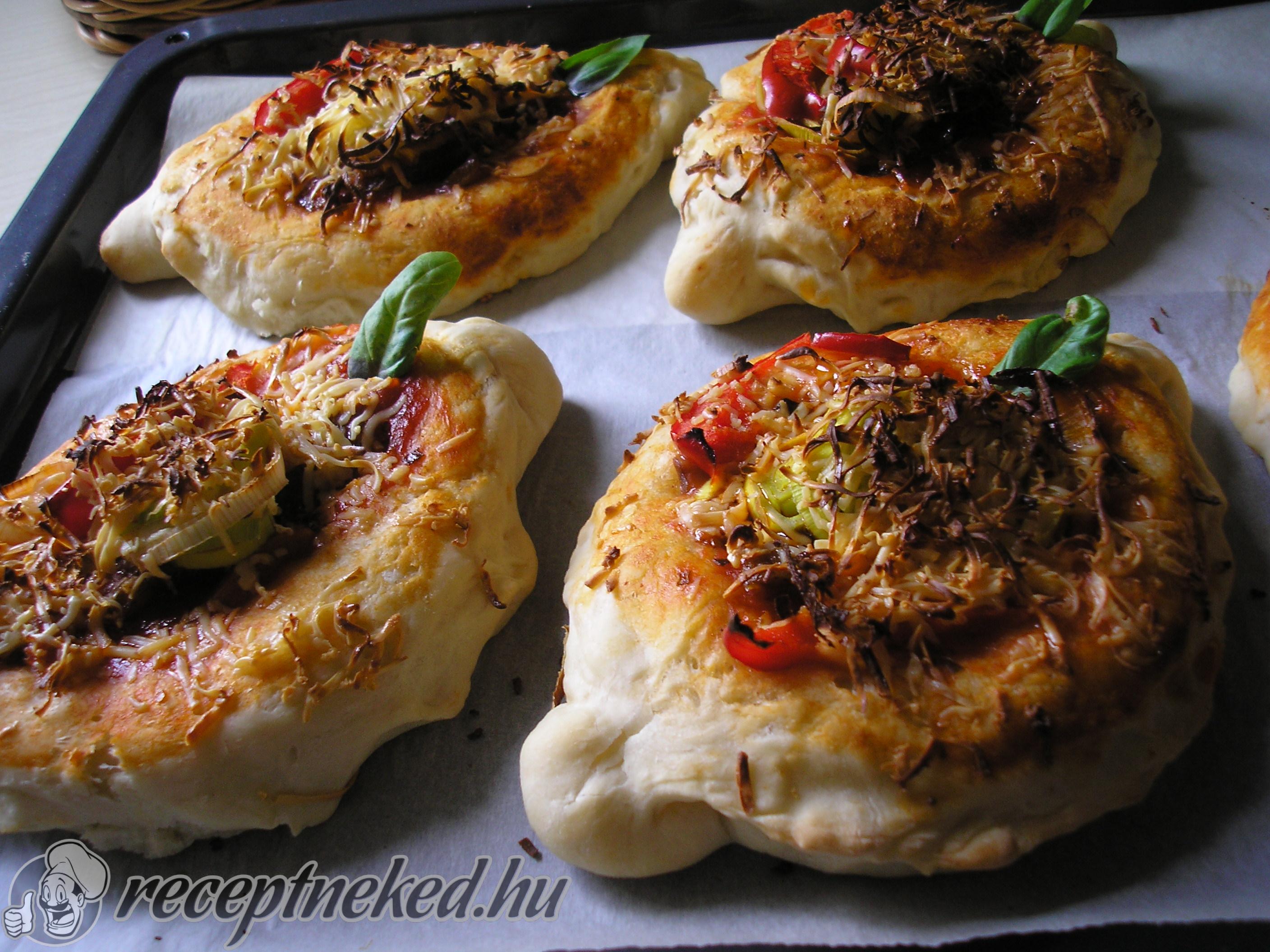 A tetejét megszórjuk reszelt sajttal, majd lekenjük a széleit tojással. 200 fokos, előmelegített sütőben 15-20 perc alatt készre sütjük.