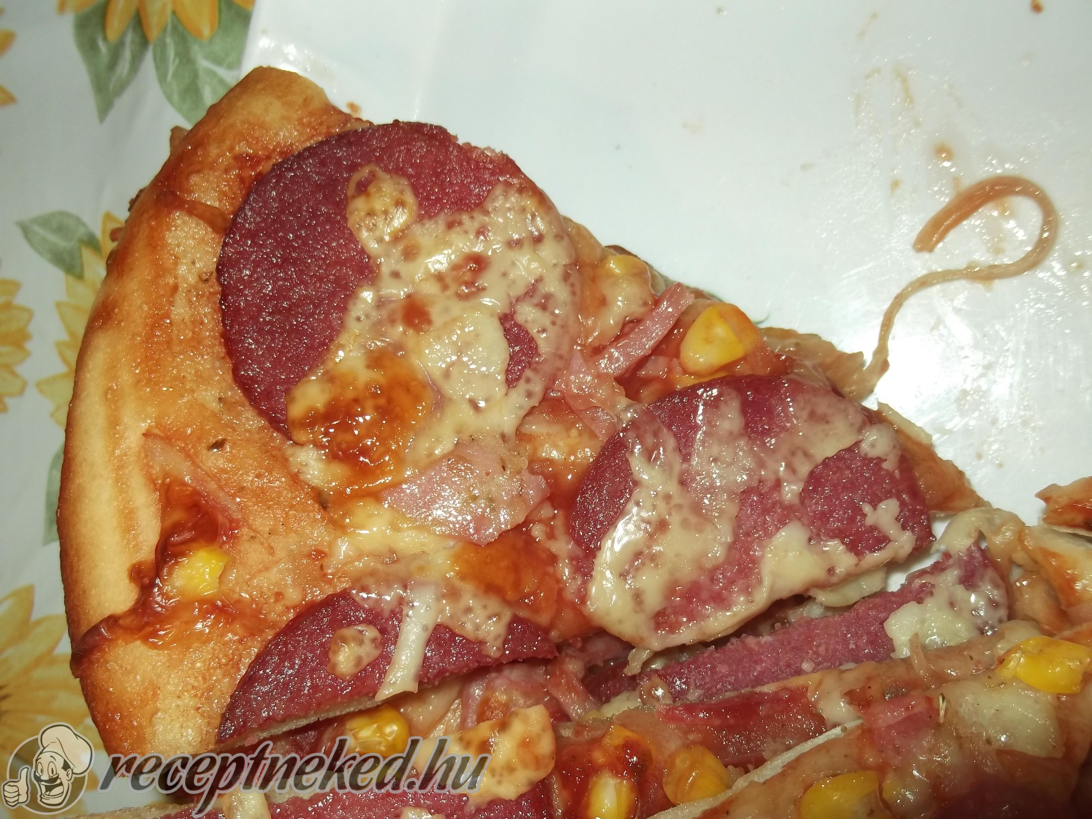 Ezutaán ízlés szerint teszünk rá sonkát, szalámit, kolbászt, kukoricát, bacont…,ki mit szeret. A legvégén bőven megszórjuk reszelt sajttal és 180 fokon kb 15-20 perc alatt készre sütjük.