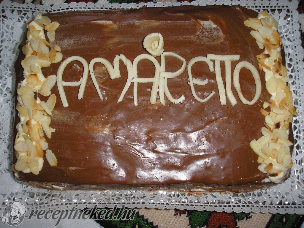 A tészta hozzávalóiból a szokásos módon kikeverjük a piskóta alapját. Egy 25*35 cm-es tepsit sütőpapírral kibélelünk, a masszát belesimítjuk. 180 fokra előmelegített sütőbe toljuk, majd 30-35 perc alattkészre sütjük. Tűpróbát végezzünk! A teljesen kihűlt tésztát 3 lapba vágjuk, majd meglocsoljuk amarettoval a lapokat.