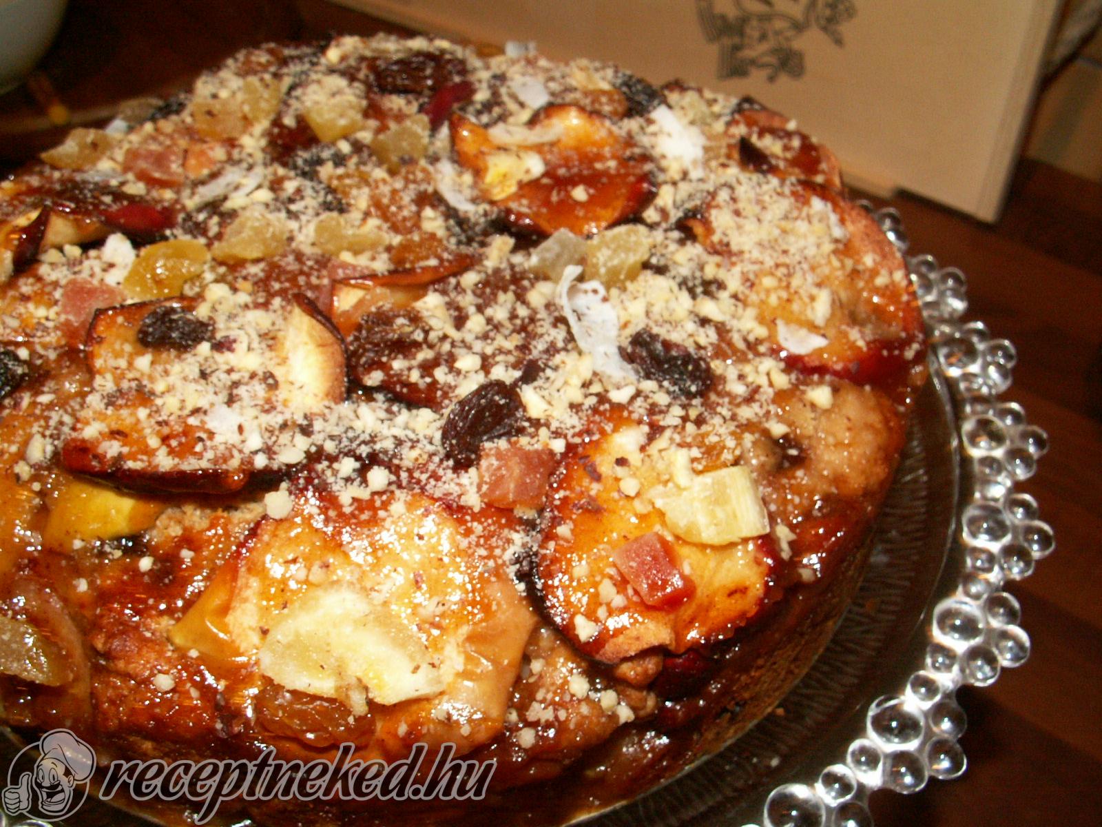 A tojásokat az olvasztott vajra ütjük, ami már kihűlt. A lisztet külön tálban keverjük el a sütőporral, a fahéjjal és a cukorral. Az almákat vágjuk nagy darabokra, és keverjük a lisztbe a fügével és a mogyoróval és/vagy dióval együtt.