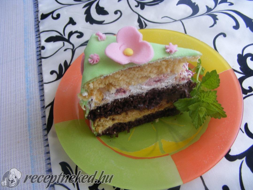 Alulra kerül egy csokis lap, erre kenjük a mandulás krémet. Ráhelyezünk egy világos lapot, amire a csokis krém kerül. Erre jön egy újabb csokis lap, amire a felvert tejszín felét kenjük. Ezt kirakjuk meggyel, majd a tejszín másik felét is rákenjük, végül a világos piskótalappal zárjuk le.