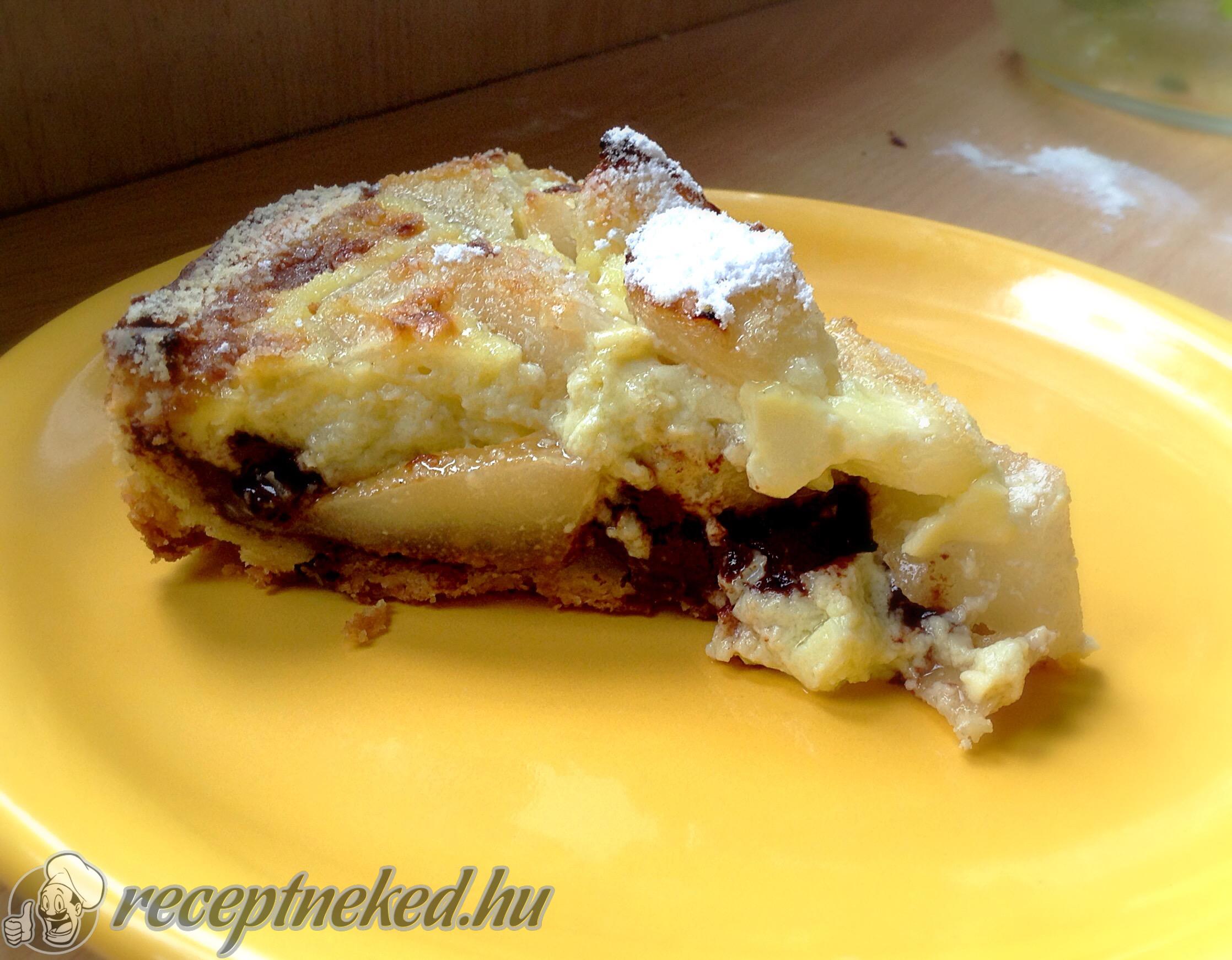 A körtéket megtisztítjuk, felkockázzuk, majd egy edénybe tesszük, leöntjük citromlével, majd pihentetjük. Ha kész a tészta, beletördeljük a csokit, ráöntjük a körtét vigyázva, hogy a citromlevet, ami hátramaradt ne öntsük bele, különben eláztathatja a tésztát. A tojást elkeverjük a cukrokkal, a mandula aromával és a tejszínnel, majd a körtére öntjük.