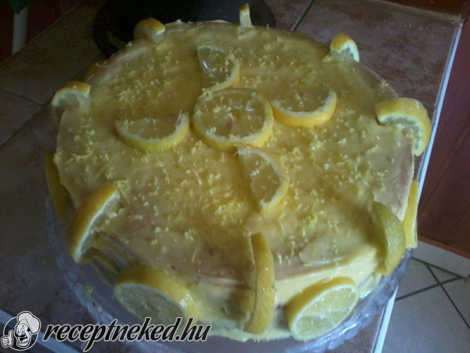 A lapot félbe vágjuk, majd az alsó felére rákenjük a krém felét, rátesszük a másik lapot és körbekenjük a tortát a maradék krémmel.