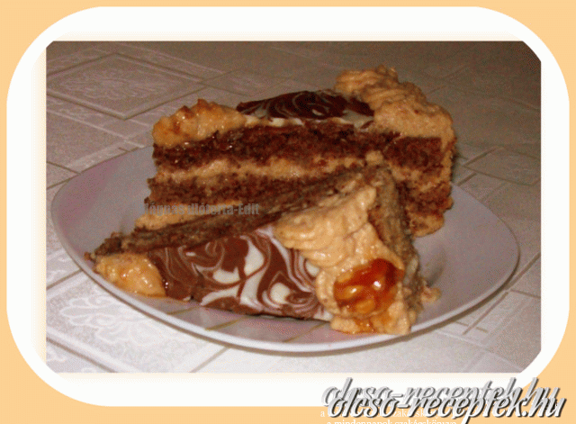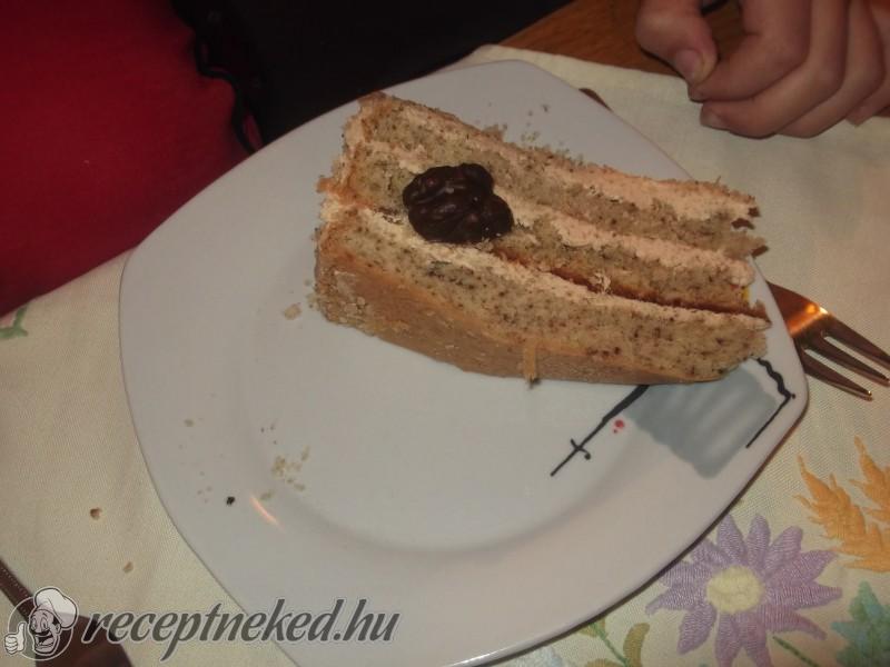 A maradék krémmel vonjuk be a tortát, majd darált dióval szórjuk körbe a tortát (a tetejét NE szórjuk meg!).