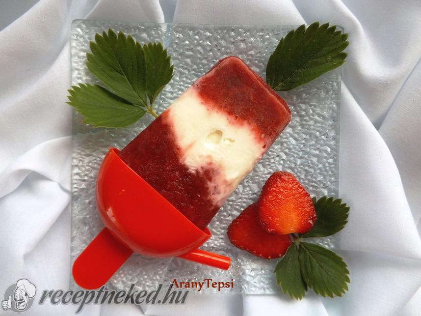 Ráhalmozzuk az előzőleg félbe vágott epreket, majd hűtőbe tesszük a betöltött tortát dermedni.