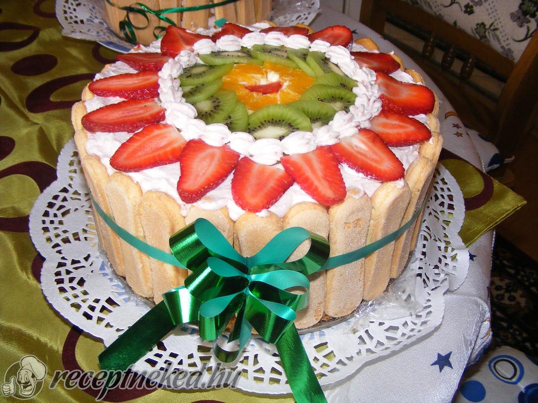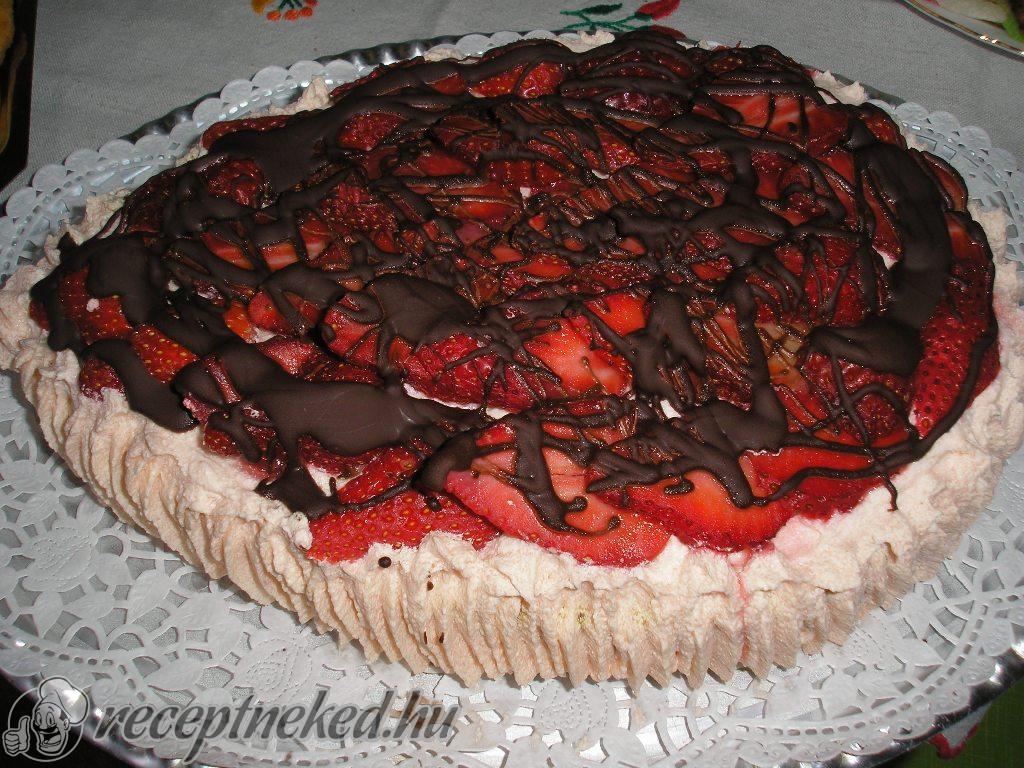 Egy 24 cm-es, magas falú forma aljára tesszük a lapot, aminek a tetejét egyenesre vágtuk. A lapon és körben a szélén, eloszlatjuk a fehércsokis krém felét, majd erre rátesszük az eperzselét és befedjük a maradék fehércsokis mousse-al. Egy éjszakára hűtőbe tesszük.