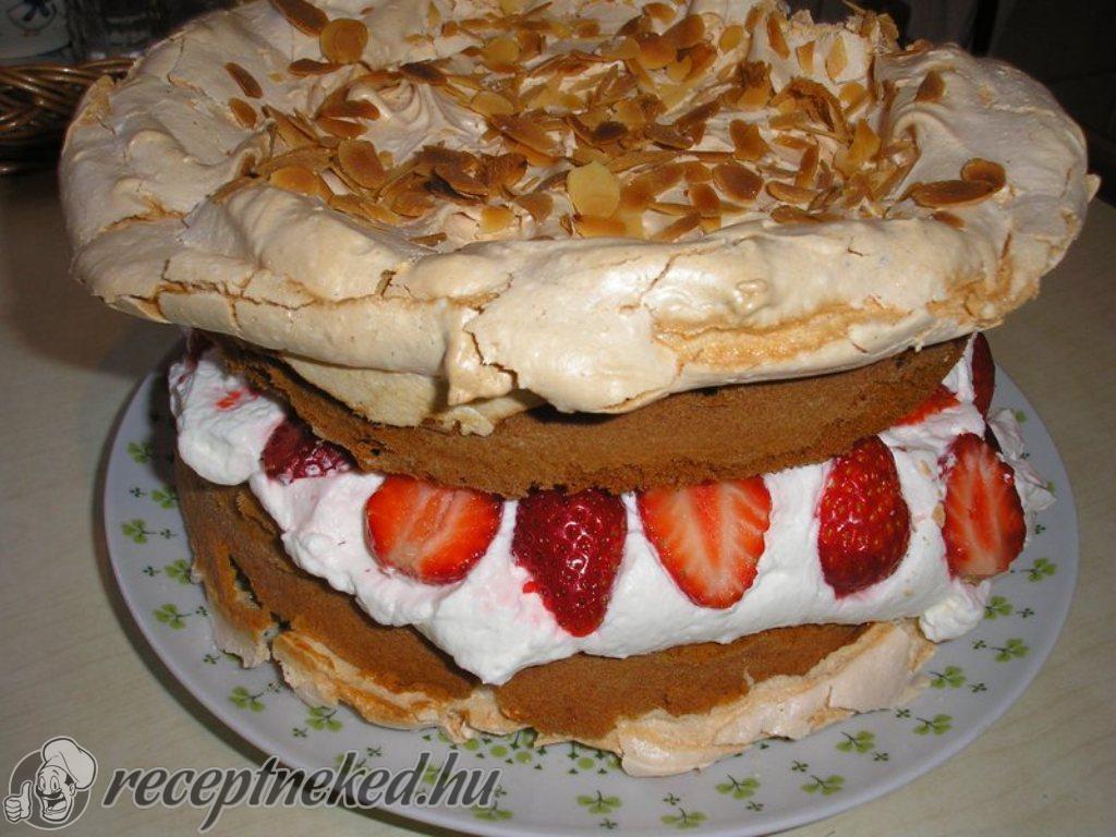 Verjük habbá a tejszínt, és pucoljuk meg, majd daraboljuk fel a földiepret; azaz a nagyobbakat szeleteljük fel hosszában, a kisebbeket pedig vágjuk egyszerűen ketté. Fektessük az egyik tortát piskótás felével felfelé egy nagyobb lapostányérra vagy tortaállványra, halmozzuk rá a tejszínhabot, kissé belenyomkodva pakoljuk meg az eperdarabokkal, végül pedig fektessük rá a másik tortát a mandulás-habcsókos felével felfelé. Kicsit nyomjuk össze az egészet, hogy jobban egyben maradjon.
