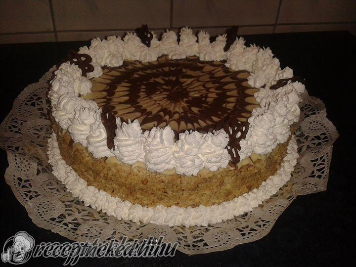 Amikor a csoki megszilárdult, akkor a torta oldalát körbekenjük a maradék krém egy részével, majd darált dióval “panírozzuk”. Ha szeretnénk, akkor a maradék krémet habzsákba szedve tovább díszíthetjük a tortát.
