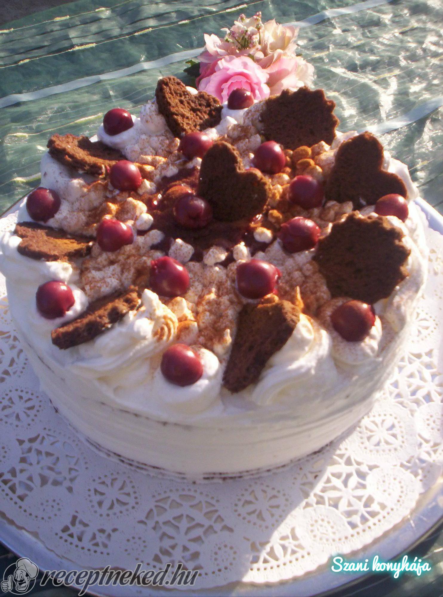 A maradék tejszínhabot egyenletesen eloszlatjuk a torta tetején és oldalán. Habzsák segítségével nagyobb díszítő mintákat nyomunk a tetejére, ezekre helyezzük a kiszúrt piskótadarabokat. Fahéjat szitálunk rá, majd a nagyobb minták közé kisebb díszítéseket nyomunk, ezek tetejére kerülnek a félretett meggyek.