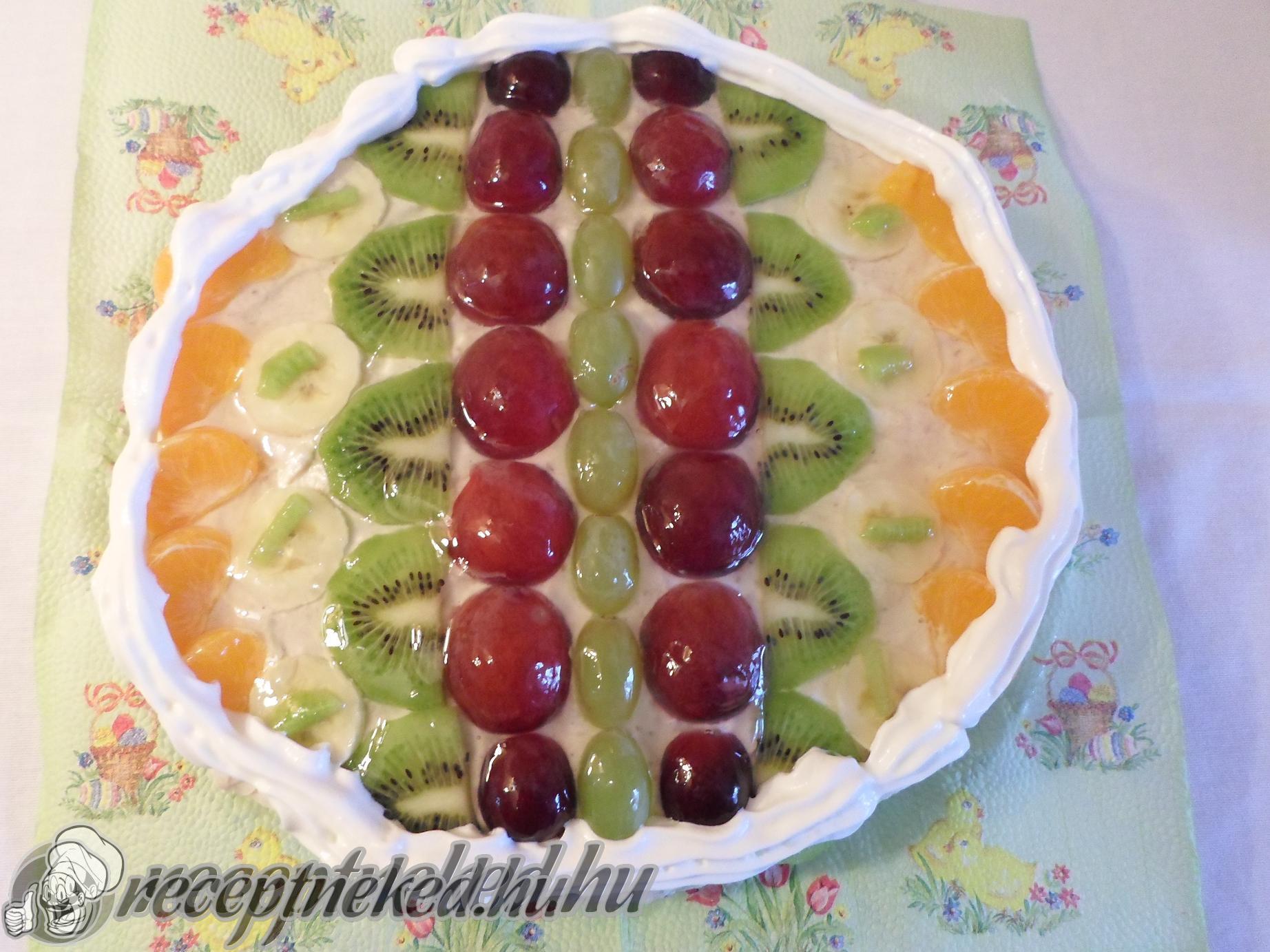 A gyümölcsöket megpucoljuk és leszeljük, majd ízlés szerint kitesszük vele a torta tetejét. A zselatint elkészítjük a csomagoláson írtak szerint és a tetejére öntjük. Tálalás előtt még kevés tejszínnel díszíthetjük.