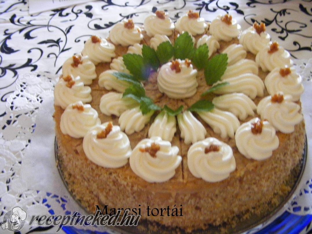 A maradék 10 dkg cukrot is karamellizáljuk, majd gyorsan eloszlatjuk a tortalapok tetején, amíg meleg. Az első lapot megkenjük a krémmel, rátesszük a következő lapot, ismét krémet kenünk rá, majd ráhelyezzük a harmadik lapot. Ha marad krém, az oldalát is bevonhatjuk vele. Ízlés szerint díszítjük.