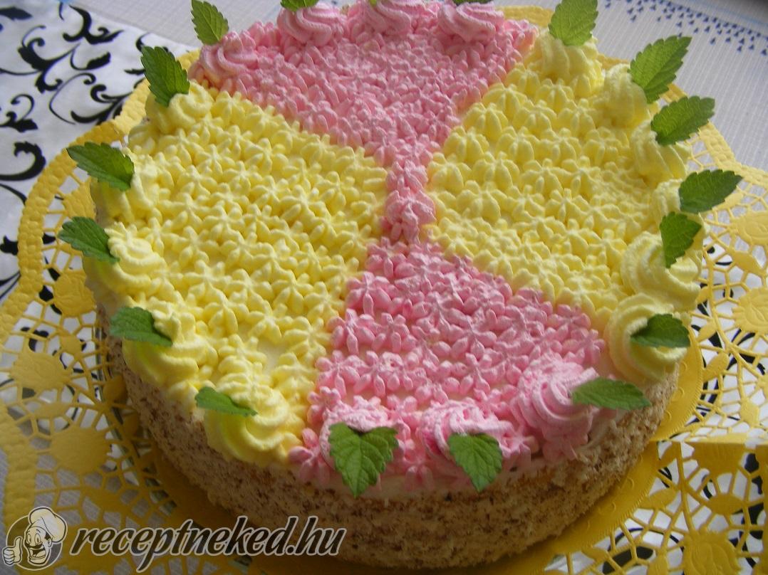 A megmaradt tejszín felét rákenjük a középső lapra, kitesszük 10-10 dkg gyümölccsel, majd rákenjük a maradék tejszínt és befedjük a harmadik lappal.