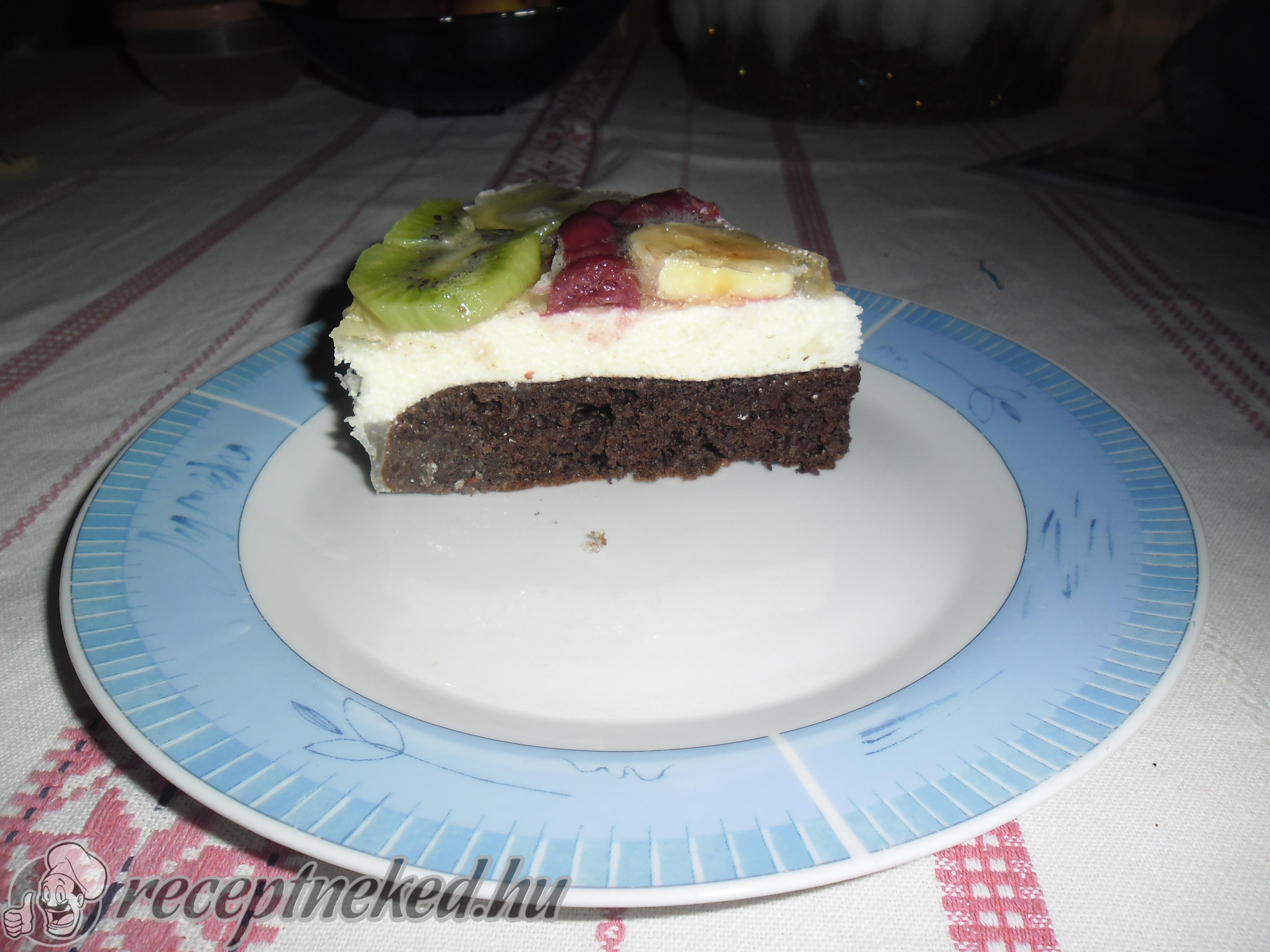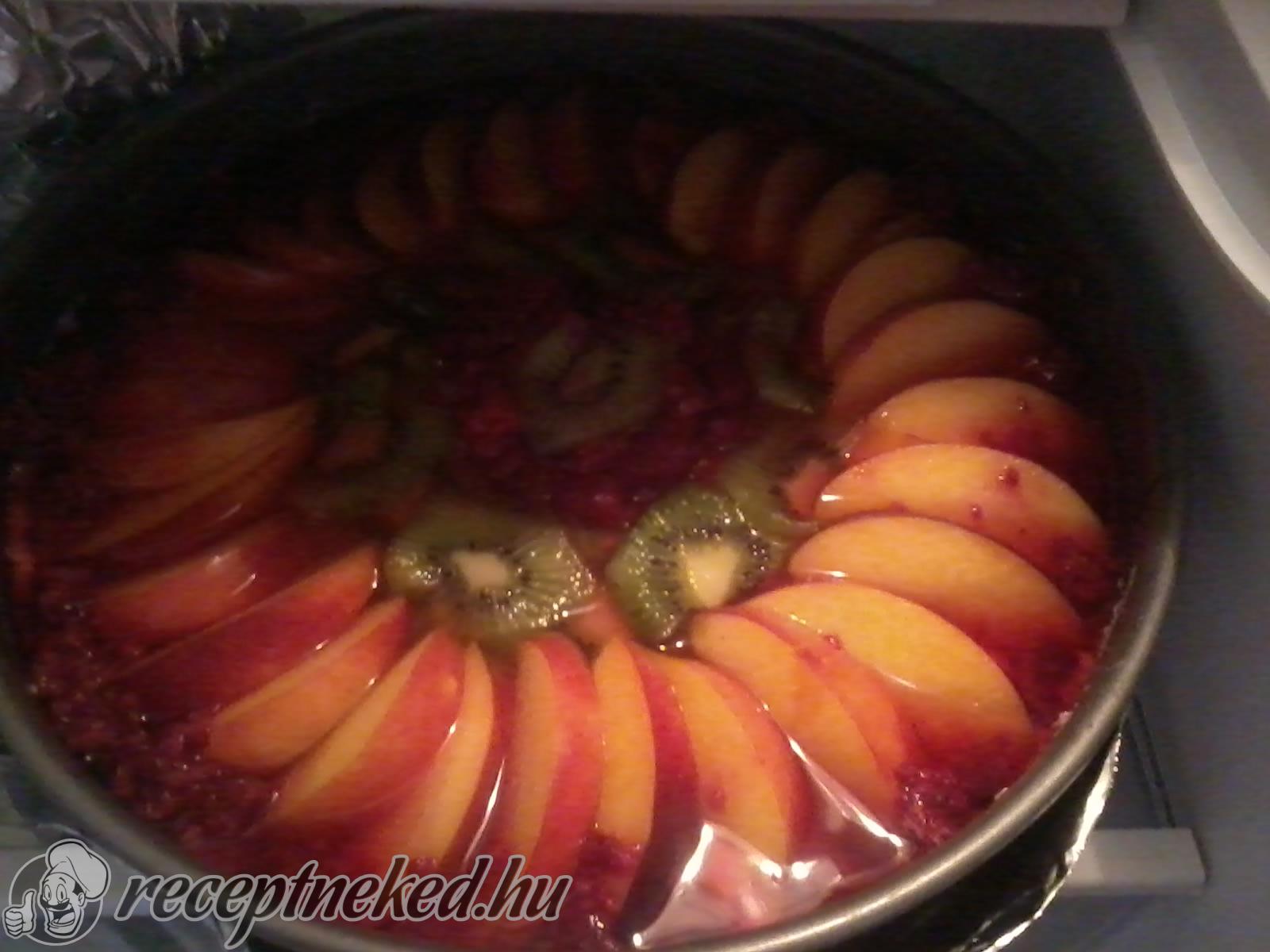 A megdermedt túrós krémre tesszük a gyümölcsöket (mi most fagyasztott gyümölcsöt használtunk, kiengedés nélkül kell a túrókrémre tenni! Nem fogja eláztatni a tortát, mivel a hideg gyümölcstől a zselatin azonnal kötni kezd, ha nem túl meleg, ezért fontos jól kihűteni felhasználás előtt.). A langysra hűlt zselatint ráöntjük a gyümölcsökre és másnapig hűtőbe tesszük.
