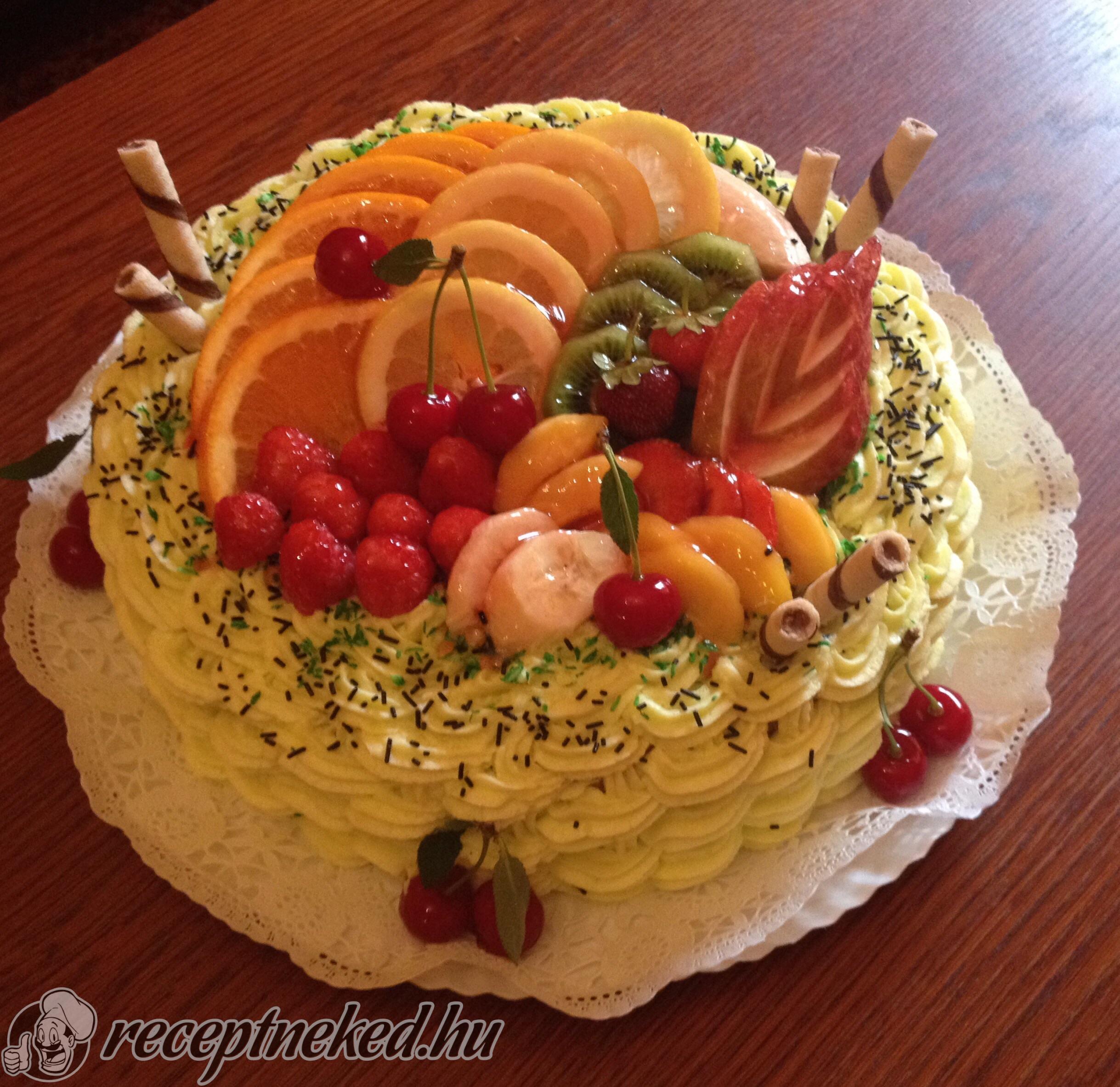 A krémmel töltsük meg belül a piskótalapokat, és a maradék krémmel kívül bevonjuk a tortát. A rétegek közé ízfokozóként apróra vágott gyümölcsöket tehetünk azokból a gyümölcsökből, amivel díszítjük.