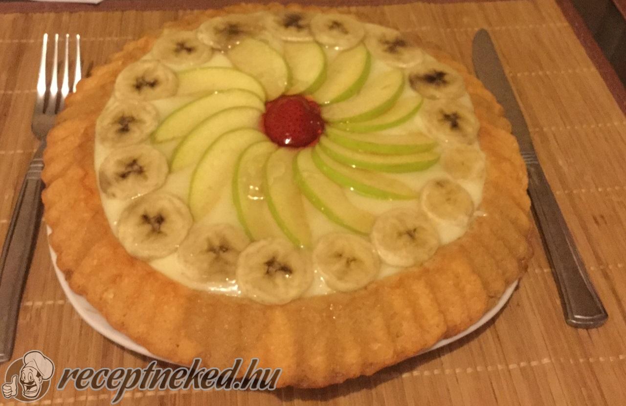 Egy gyümölcstorta formát előveszünk és kikenjük vajjal, majd beleöntjük a masszát és szépen elegyengetjük. A sütőt 180 fokra melegítjük, 25-30 perc alatt megsütjük a lapot.