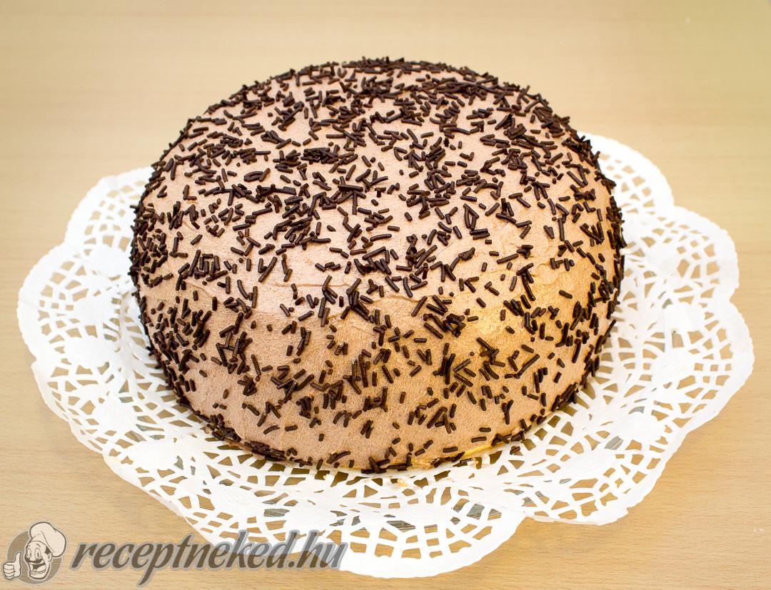 A tortát óvatosan kifordítjuk egy tálcára és bevonjuk a maradék krémmel. Tortadarával díszíthetjük.