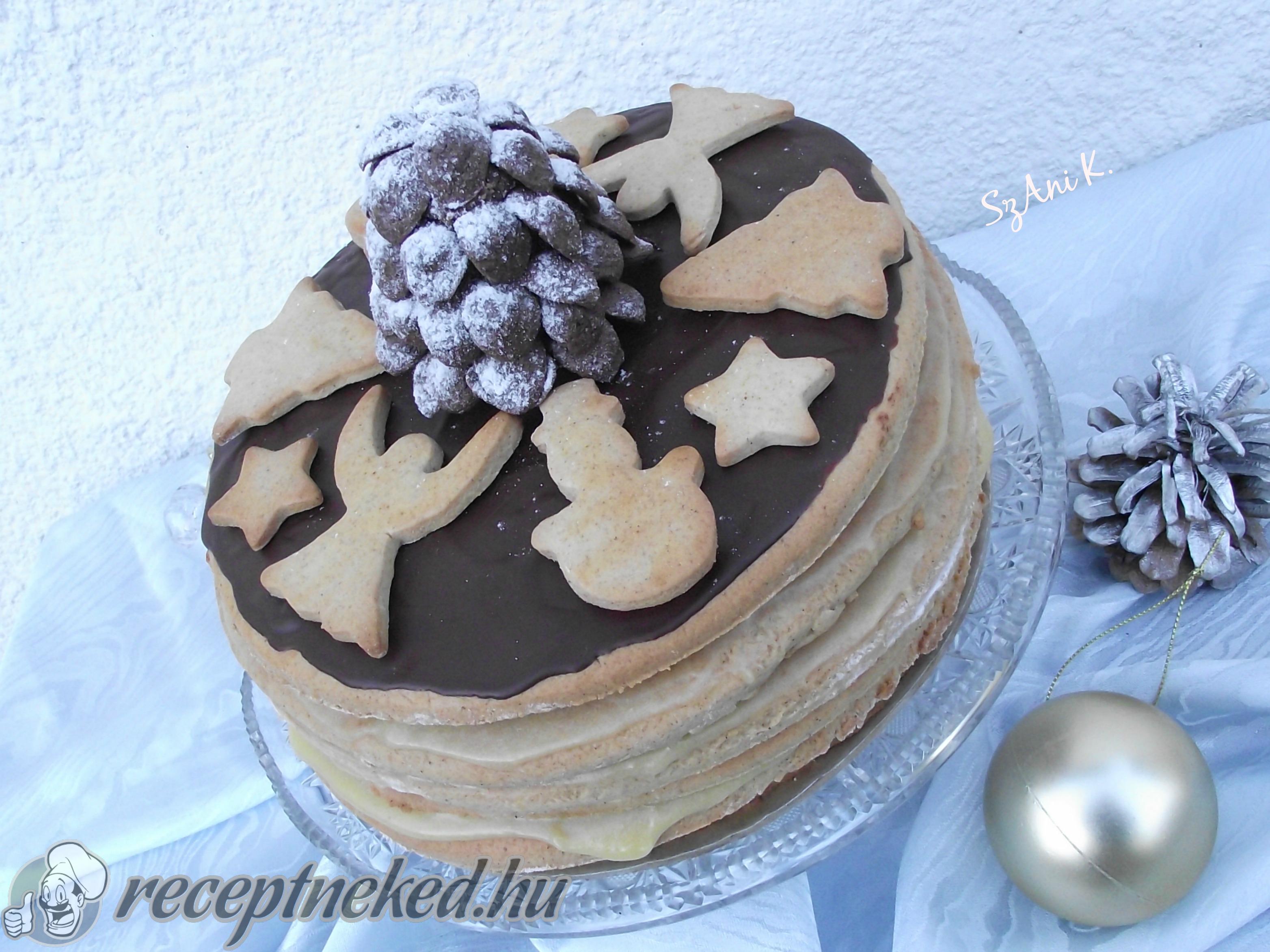 A díszítéshez lemetszünk pár szál kisujjnyi hosszúságú friss rozmaringot, közéjük csipkebogyót vagy marcipán bogyó halmocskákat teszünk. Két szál rozmaringot a torta felső negyedére teszünk, alá 3 rúd fahéjat és az egész tortát jól meghintjük porccukorral.