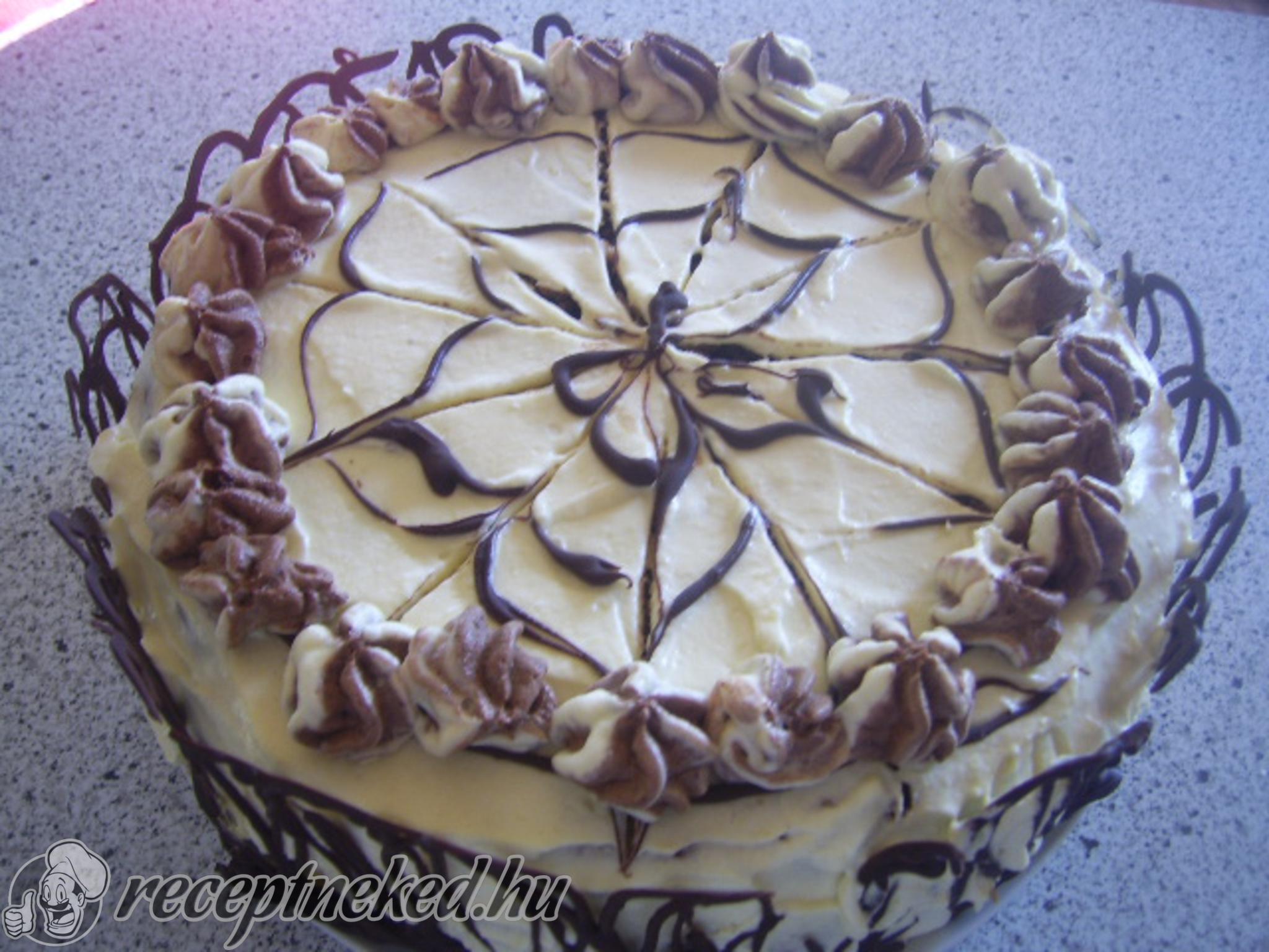 Ha a tészta kihűlt, akkor vágjuk két lapba, majd töltsük meg a krémmel, de hagyjunk az oldalára és a tetejére is.