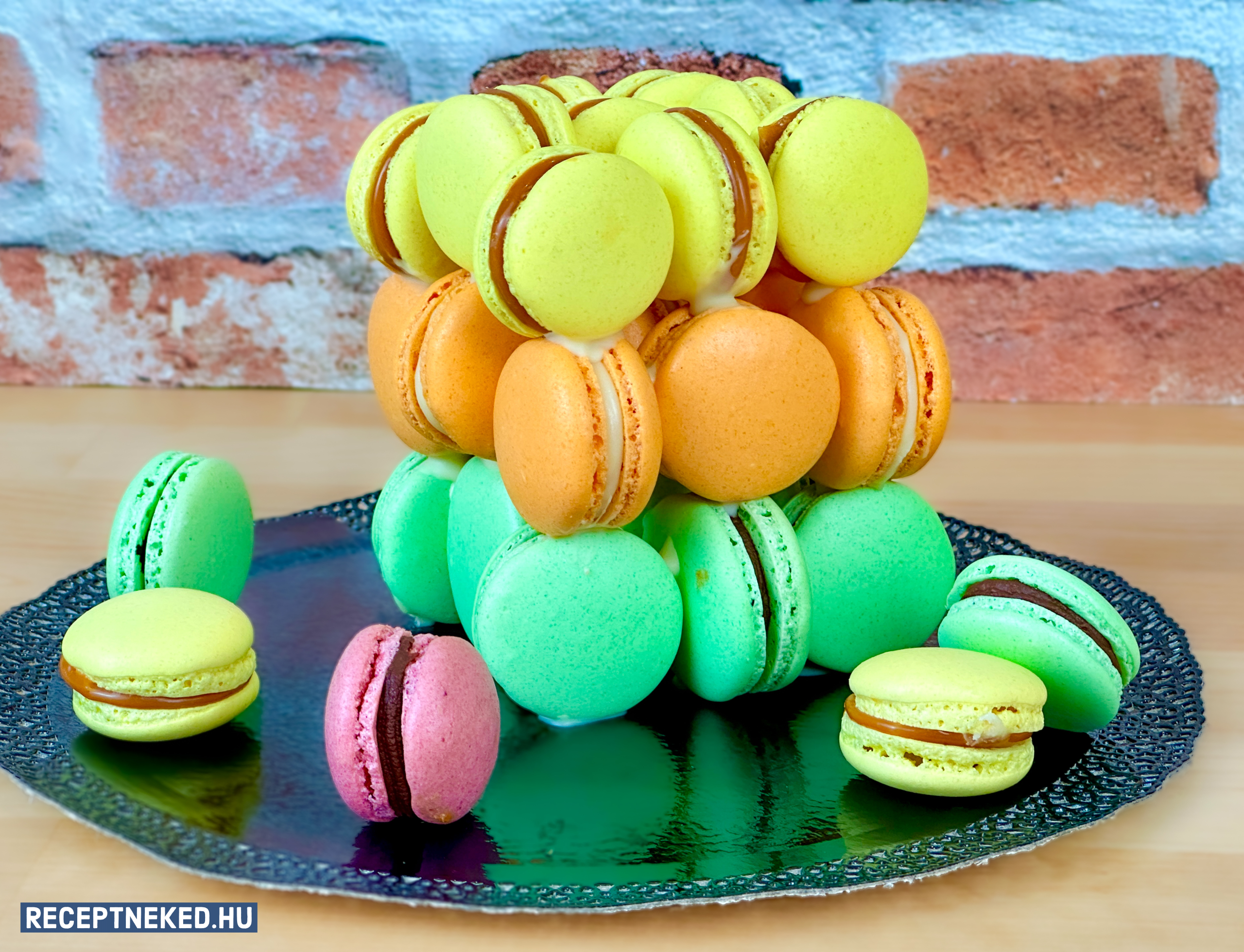 Felolvasztjuk a fehércsokit és egy habzsákba tesszük. A sarkára egy kicsi lyukat vágunk. A képen látható módon elkezdjük összeállítani a tortát. Kevés olvasztott csokival ragasztjuk össze a macaronokat. Ha kész az alsó sor, akkor tegyük hűtőbe kevés időre, majd jöhet a következő.