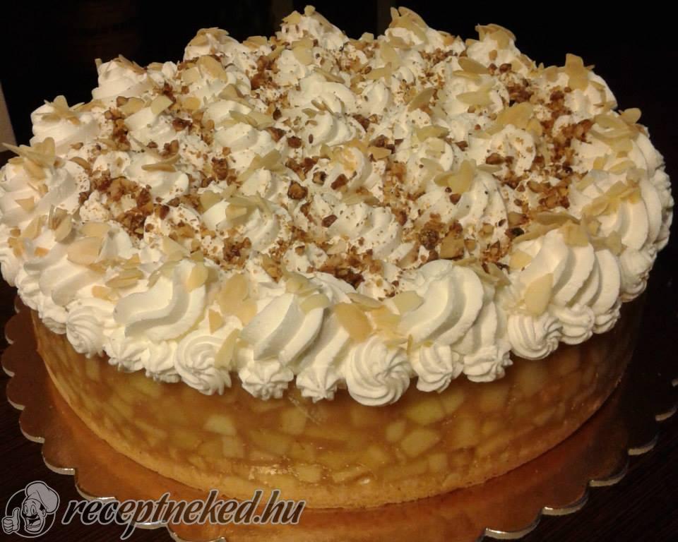 Amikor megdermedt a töltelék, óvatosan lecsatoljuk a formát, tortatálcára helyezzük, és a felvert tejszínnel, a grillázzsal és szeletelt mandulával tetszőlegesen díszítjük.