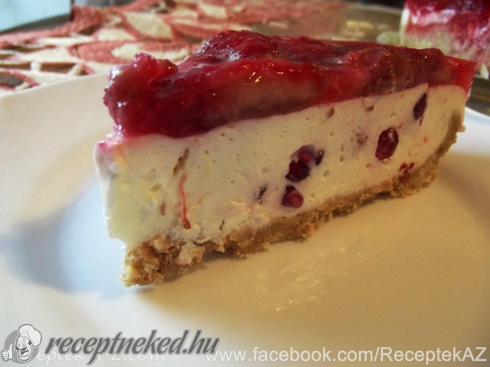 A kész krém 2/3-át ráöntjük a kekszes alapra, megszórjuk a gránátalmával, és ráöntjük a maradék krémet. Hideg helyen hagyjuk kb. 4 órát megdermedni.