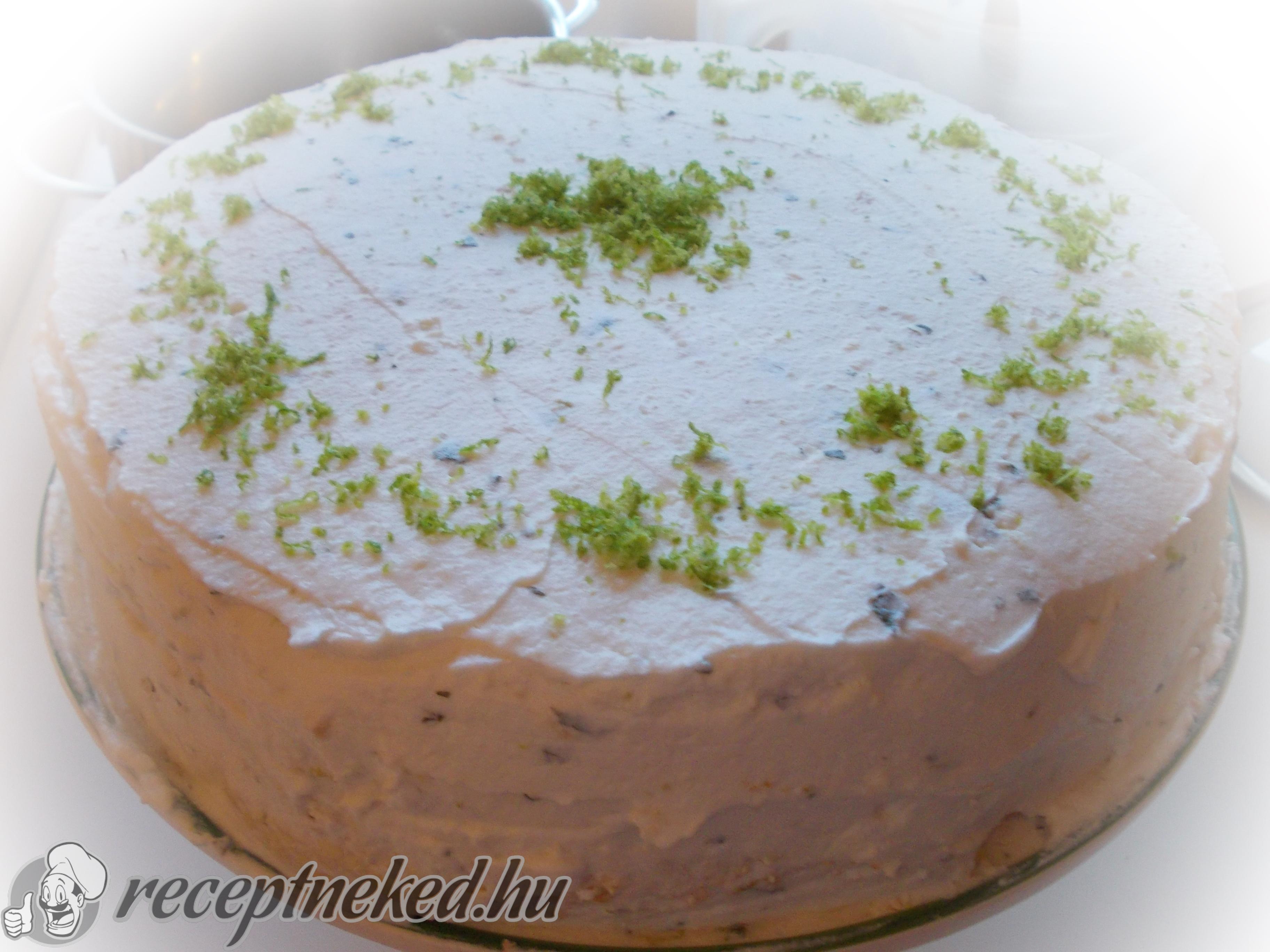 Hűtés után a maradék krémmel vonjuk be a tortát, majd mentával és lime gerezdekkel díszítsük fel.